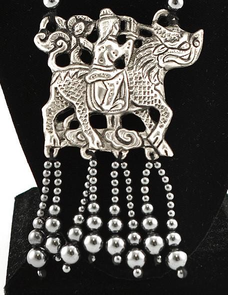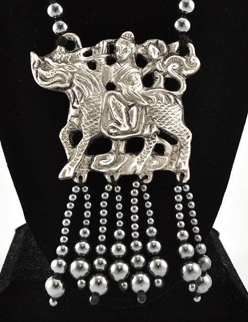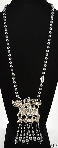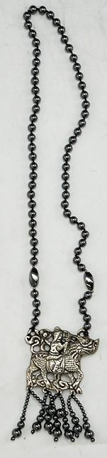 Presented is a long beaded necklace featuring a silver plated on copper pendant. The necklace features genuine hematite beads that measures about 8.1 mm. The pendant is silver plated and features a person riding a dragon/horse. The pendant has hematite beads hanging from the bottom of it too.