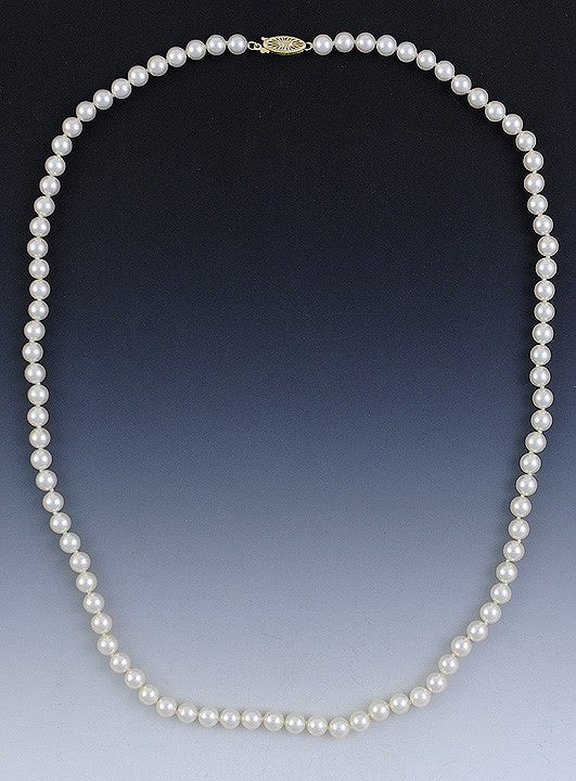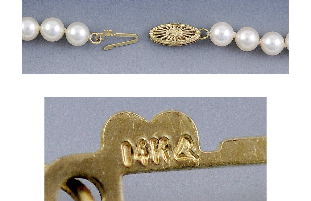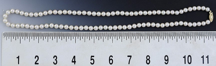 approximately 6.4 millimeters in diameter. The clasp is 14 karat yellow gold and