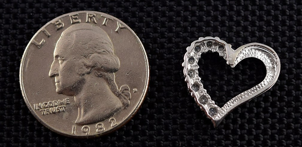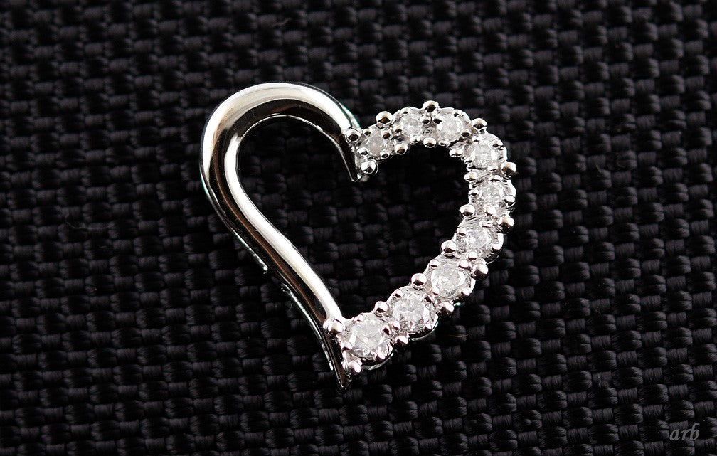 The open heart pendant hangs at an angle. It is set with several diamonds. The stones are real diamonds. We estimate that there is 1/4th of a carat in diamonds in this piece.