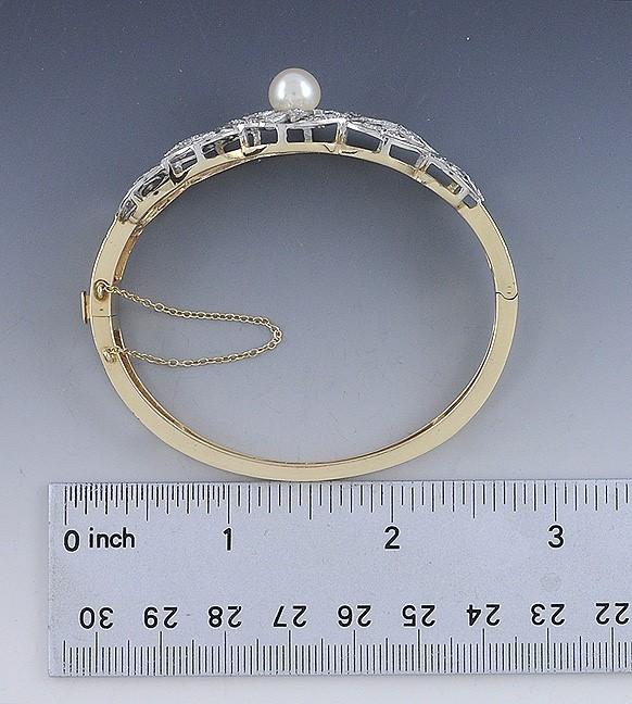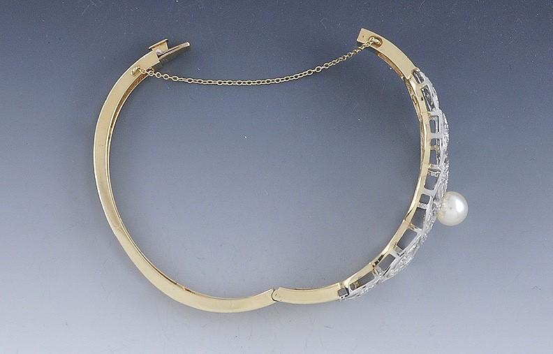 Lovely 14k Gold Pearl & .75ct Diamond Filigree Openwork Hinge Cuff Bracelet