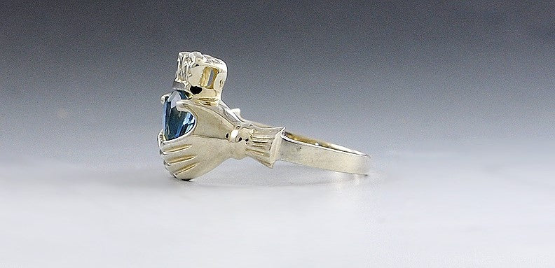 Lovely 14k White Gold and Blue Topaz Stone Irish Claddagh Ring Sz 5.75