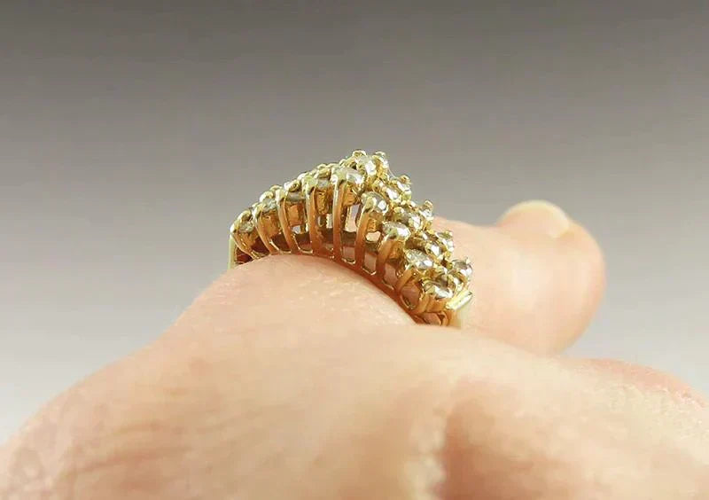 Presented is a lovely, 14 karat yellow gold and natural diamond gemstone waterfall style ring. The decorative top is securely set with 27 sparkling diamonds. There is approximately 1/2 carat in total diamond weight, the stones are I clarity and I-J color. This ring is a size 5 3/4 and it can be resized by a professional jeweler.