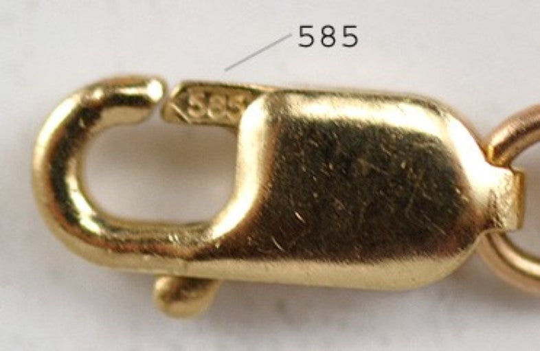 The clasp is stamped 585 for 14K yellow gold. The beads are also 14K, acid tested and guaranteed.