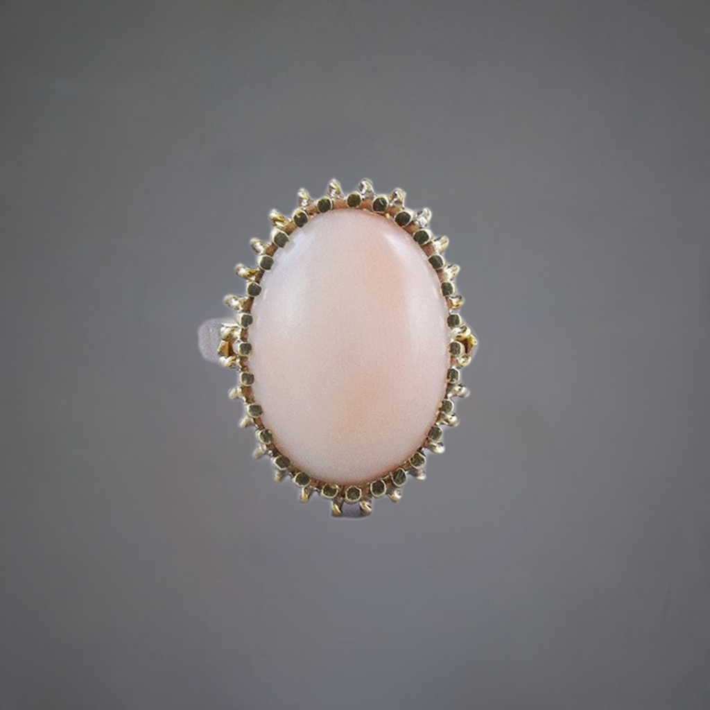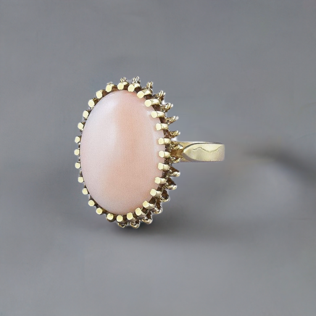 Lovely 18k Yellow Gold & Coral Pink Cabochon Ring Size 4.5