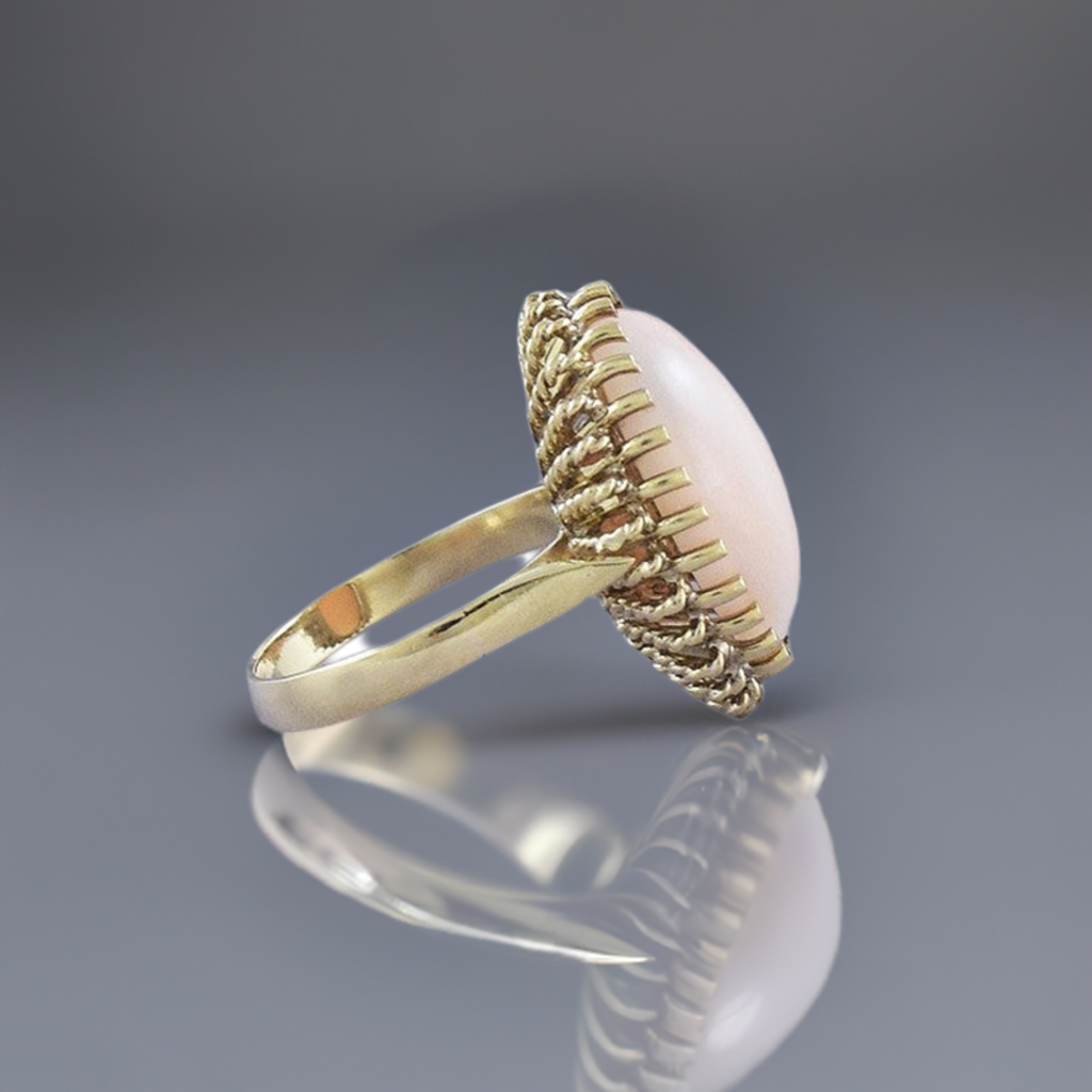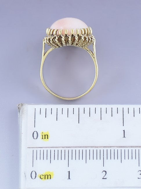 Presented is a beautiful 18 karat gold and coral ring. This is a modern ring, likely made in Italy as most coral pieces of this type are. The ring is set with an oval cabochon of coral, measuring about 15.5 by 11 millimeters. The coral is a lovely delicate light pink, with subtle blush mottling here and there. The setting is done in a stylish rope twist design, with very many prongs to hold the coral in place. A very attractive and well made piece.