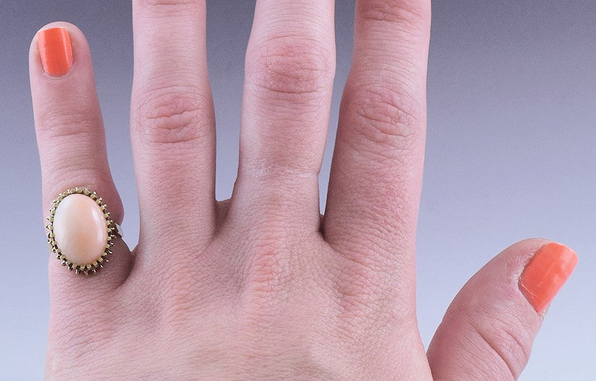 The ring is in great condition. The coral is well set, with no chips and no cracks. The prongs are in good condition, sturdy and secure. There are no breaks and no repairs.