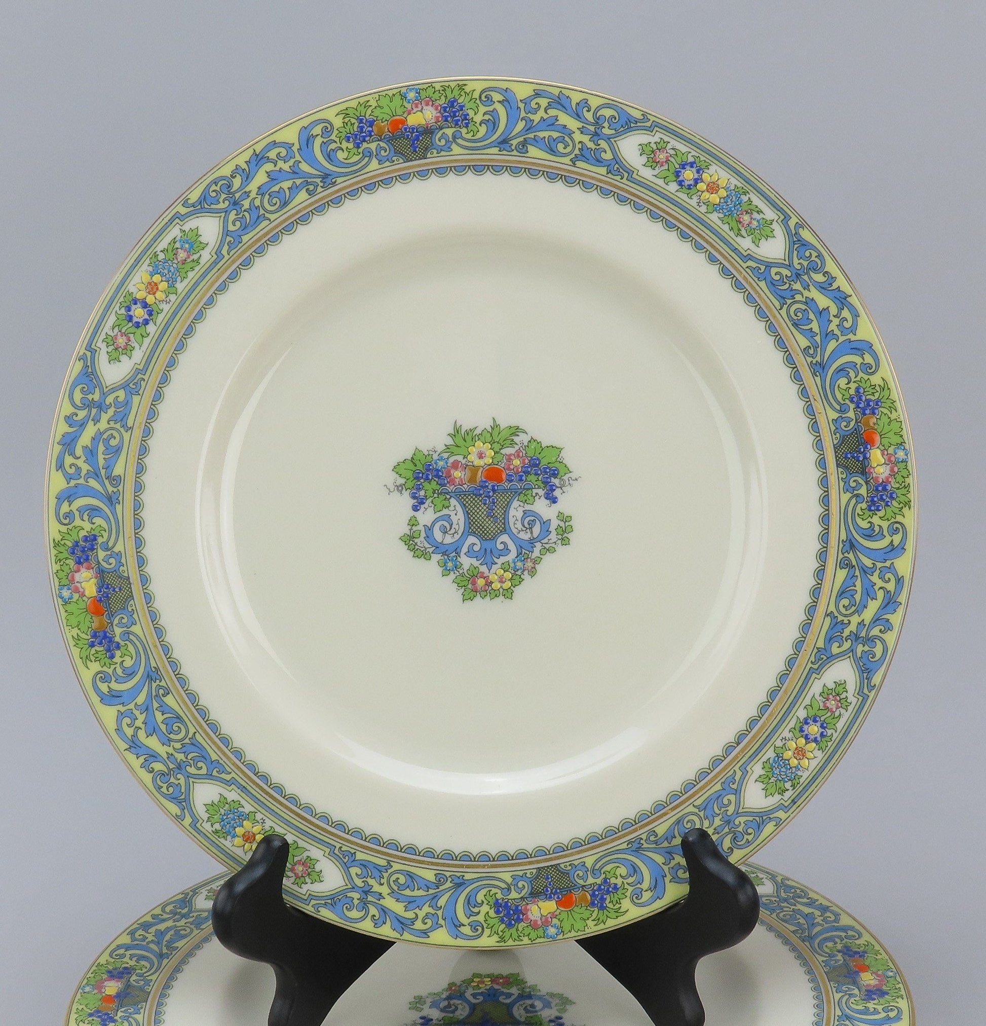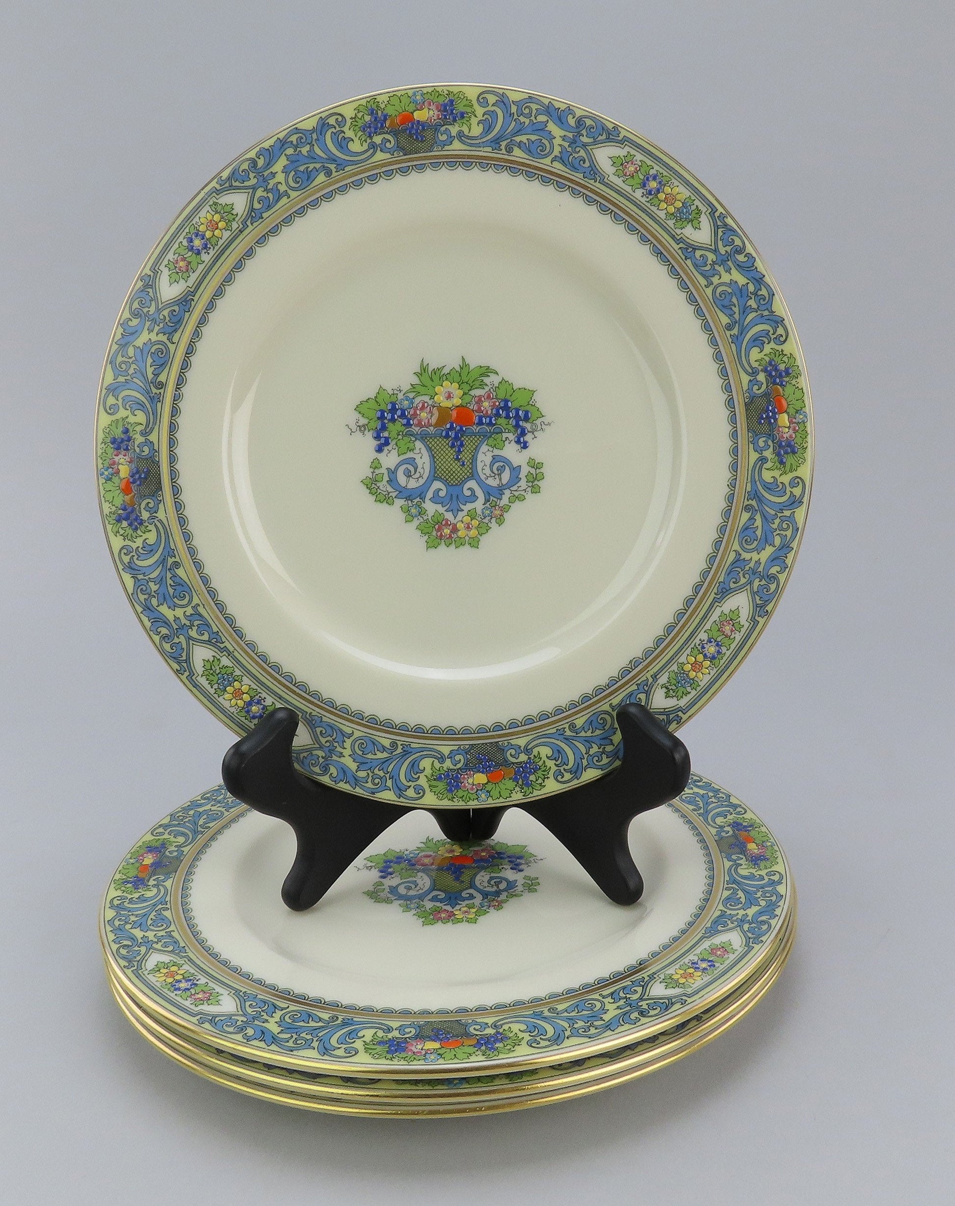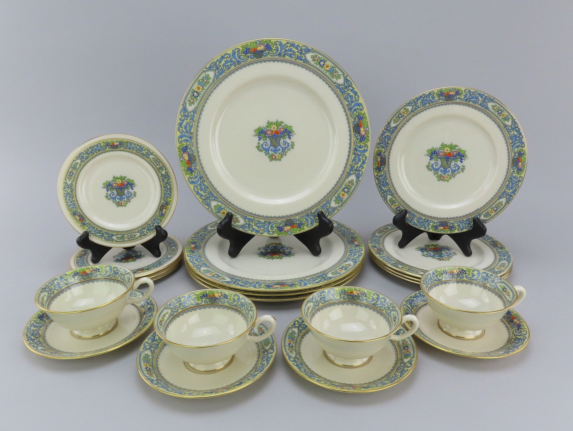 Presented is a set of 4 porcelain 5-piece place settings from Lenox. This is a 20-piece set in the Autumn pattern, which is a classic Lenox pattern that's been in production for almost 100 years. The pattern displays a beautiful cream boarder and blue scrolls with fruit and flowers. The center of the dishes displays a similar motif , both places filled with colorful fruit and flowers which are painted in a raised enamel.