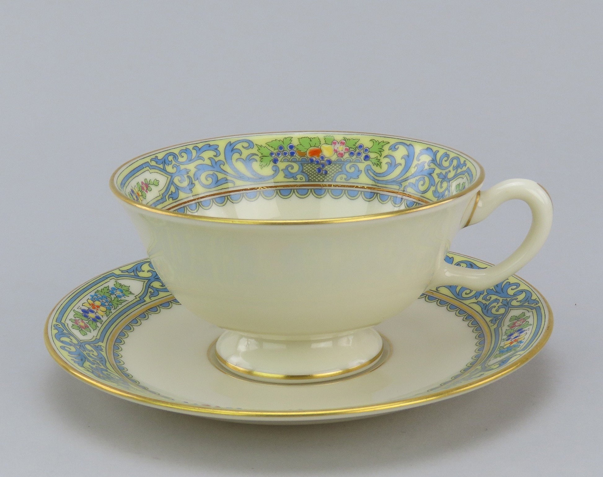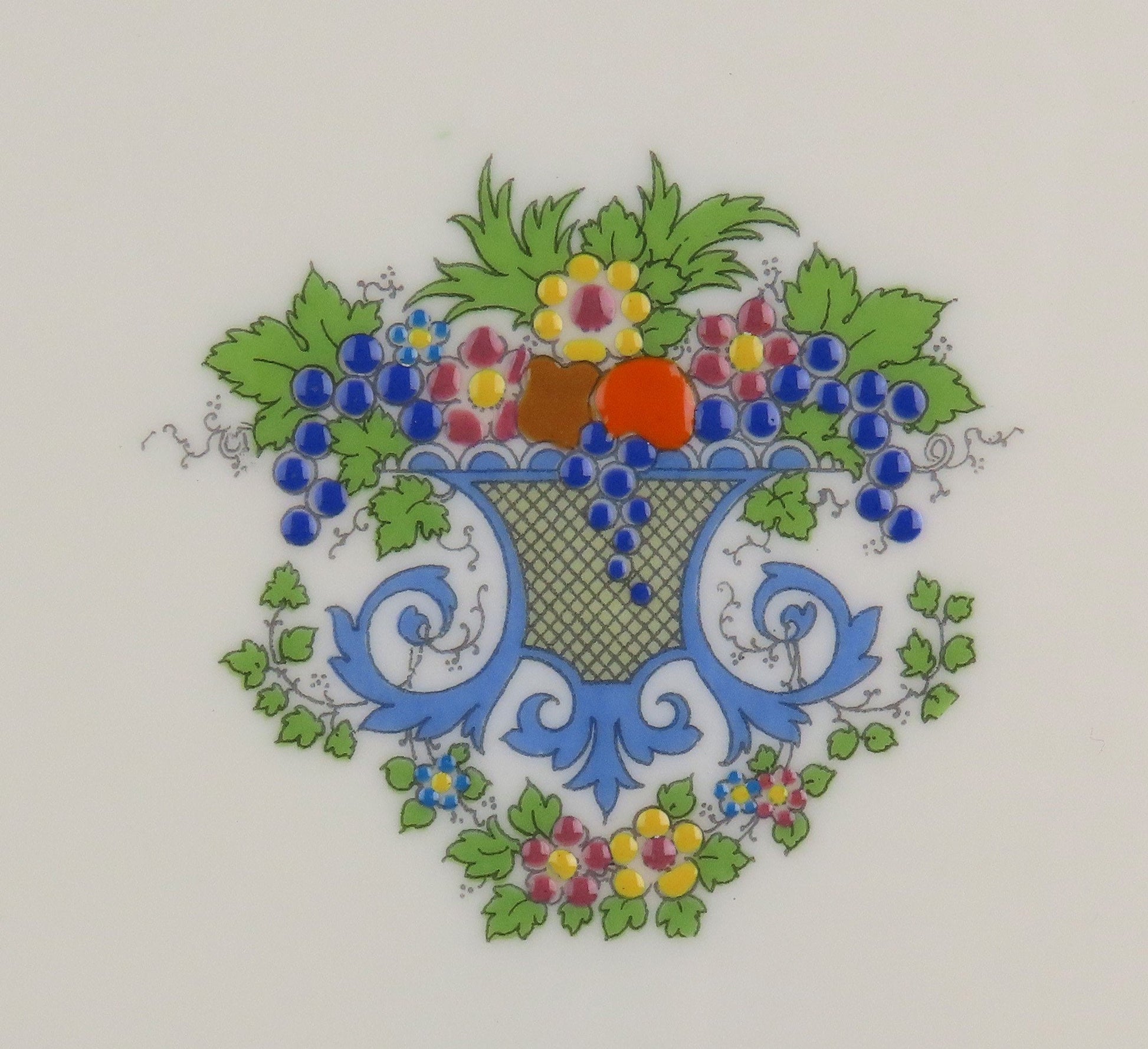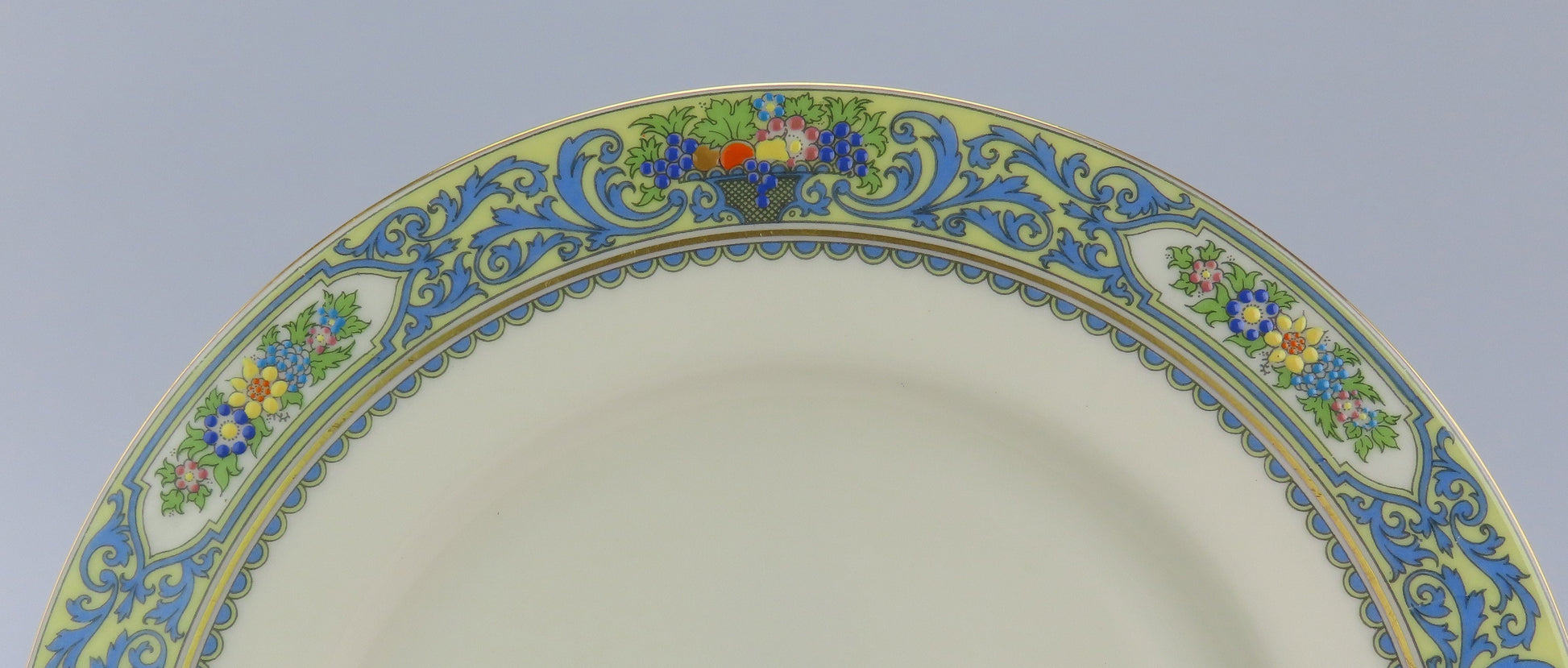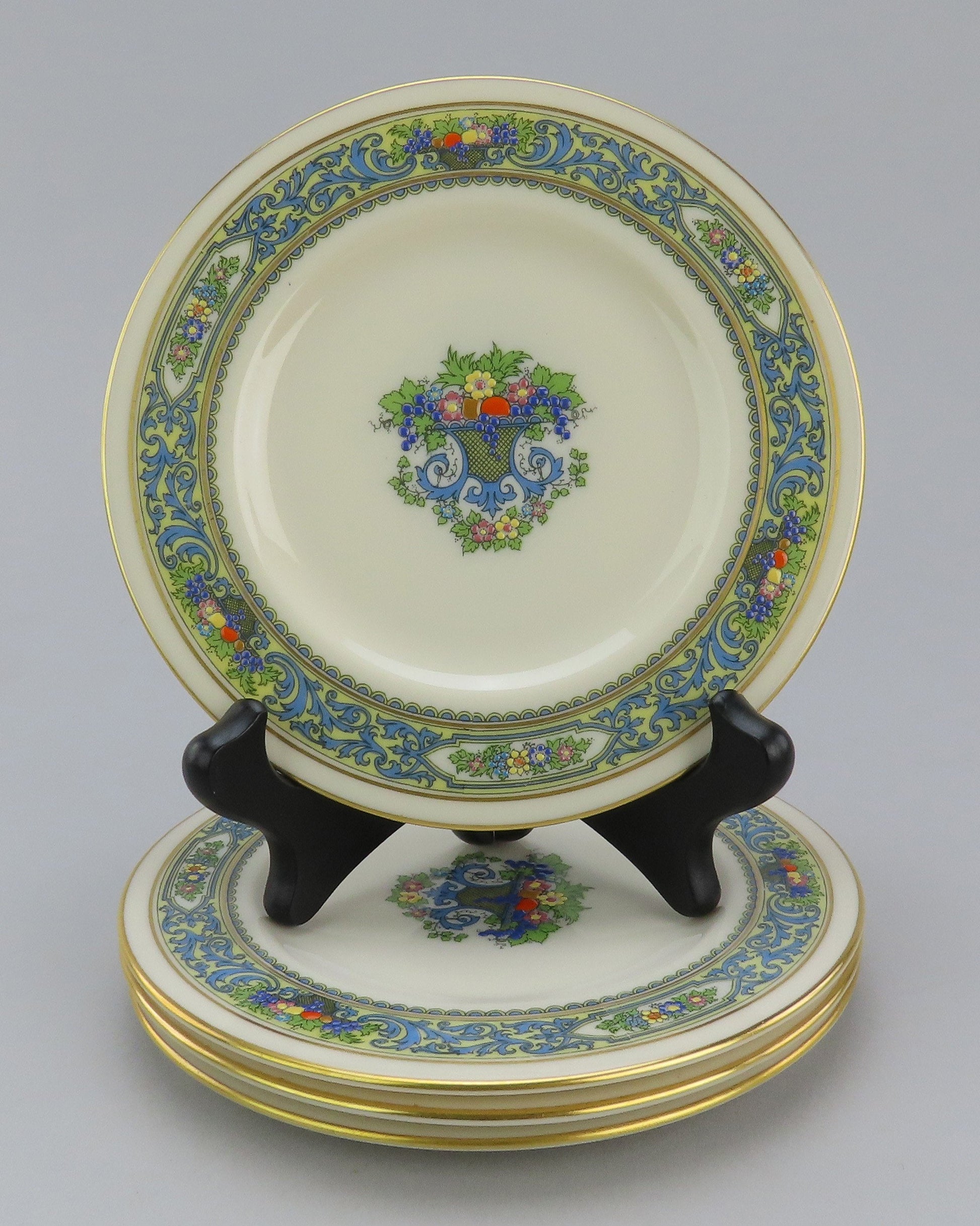 Presented is a set of 4 porcelain 5-piece place settings from Lenox. This is a 20-piece set in the Autumn pattern, which is a classic Lenox pattern that's been in production for almost 100 years. The pattern displays a beautiful cream boarder and blue scrolls with fruit and flowers. The center of the dishes displays a similar motif , both places filled with colorful fruit and flowers which are painted in a raised enamel.