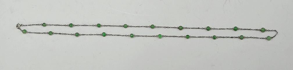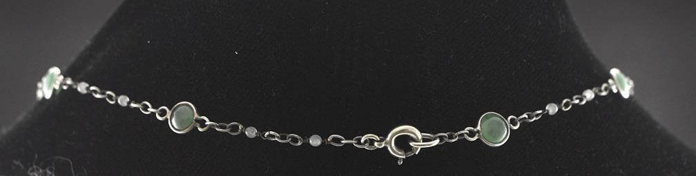 Presented is a lovely silver and genuine jade necklace. The necklace is a single strand of silver links and round jade beads.