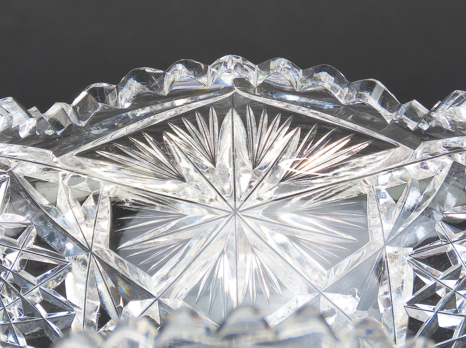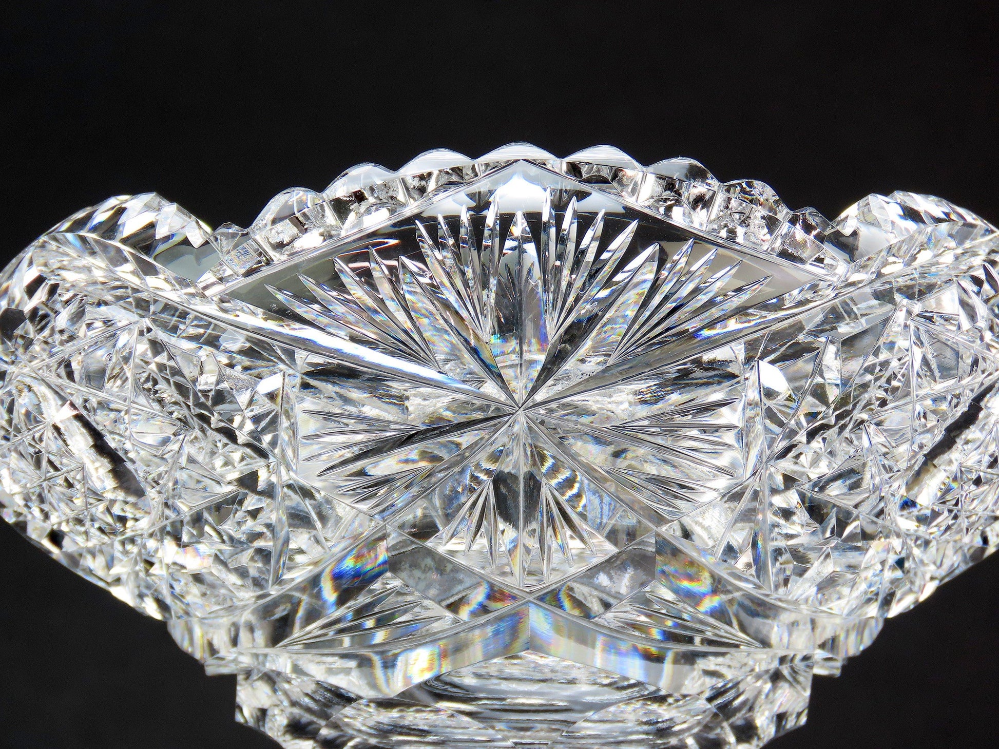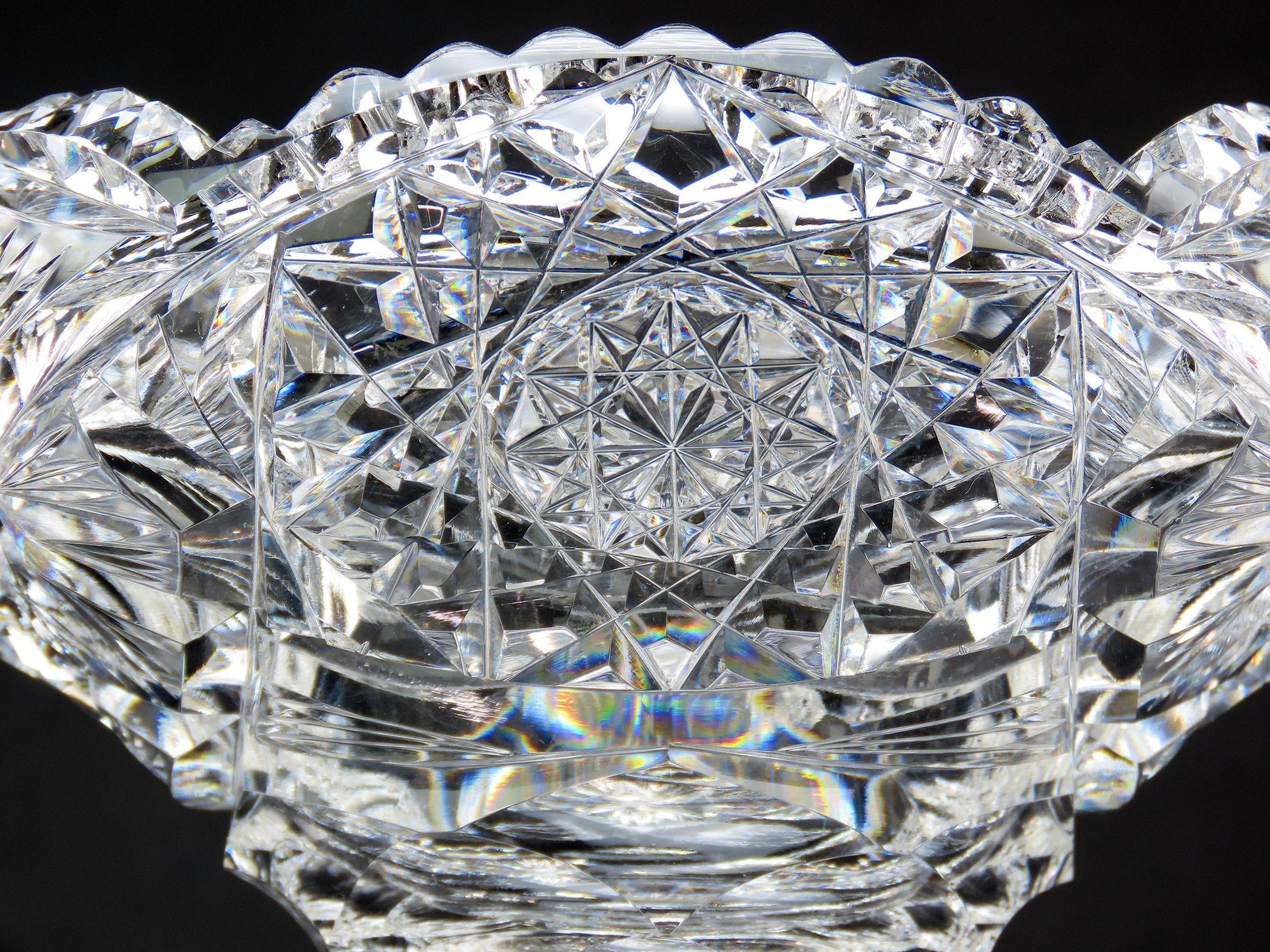 Presented is a wonderful American Brilliant Period cut glass compote or pedestal bowl, perfect for a candy dish. This piece dates to circa 1900-1925, and is unsigned, but the high quality of the work suggests a high end, well known maker like Hawkes, Tuthill, Dorflinger, or the like. The basin of the bowl is beautifully cut with intricate hobstars and fans which catch the light dazzlingly. The rim is done in a classical toothed and scalloped design, while the pedestal foot has a rayed star cut into the bottom. Really a lovely little dish.
