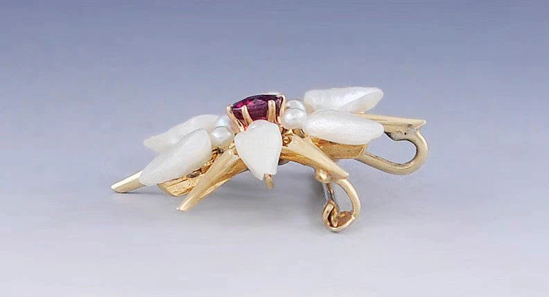 This piece is in great condition. The ruby and pearls are all well set. There are no breaks and no repairs.