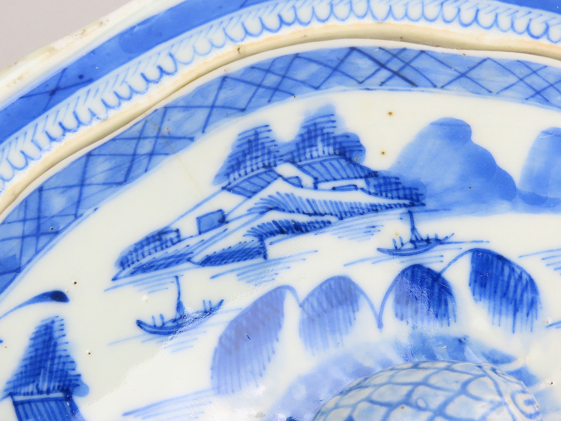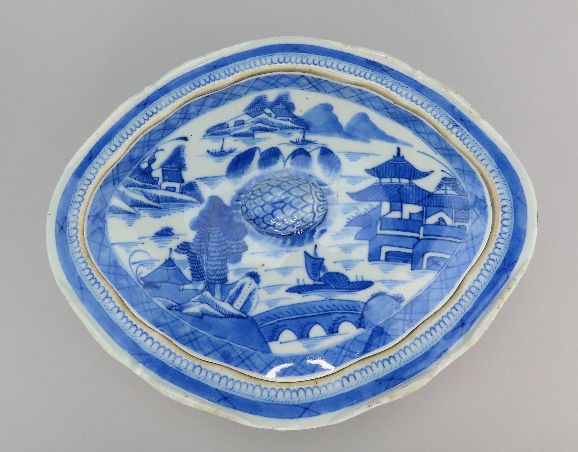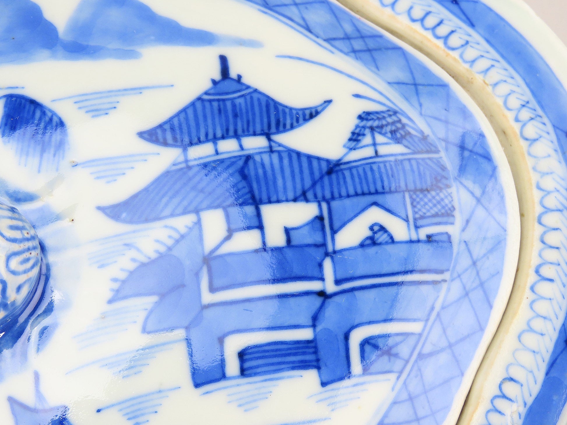 Presented is a pair of lovely Chinese covered entree dishes from the mid to late 1800s. This pair is in the Canton pattern which displays beautiful blue and white colors. The lid and interior base of the dish displays a gorgeous landscape scene. The lid has a interesting button handle shaped as a fruit. The exterior sides of the dish display beautiful flower decorations and a wide rim.