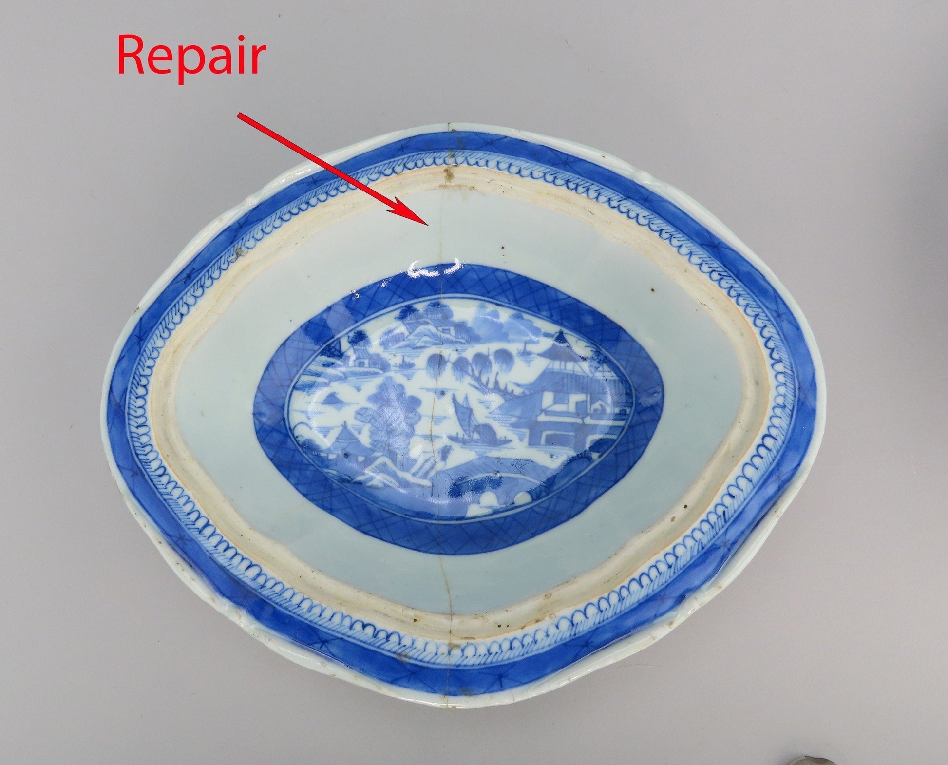 As identified in the photos, one of the dishes has been broken in half and the lid has a crack. This piece is still perfectly usable but we have taken the damage into consideration when pricing the pair. The other dish has a few minor chips along the rimmed edge. This dish has no breaks and no repairs.