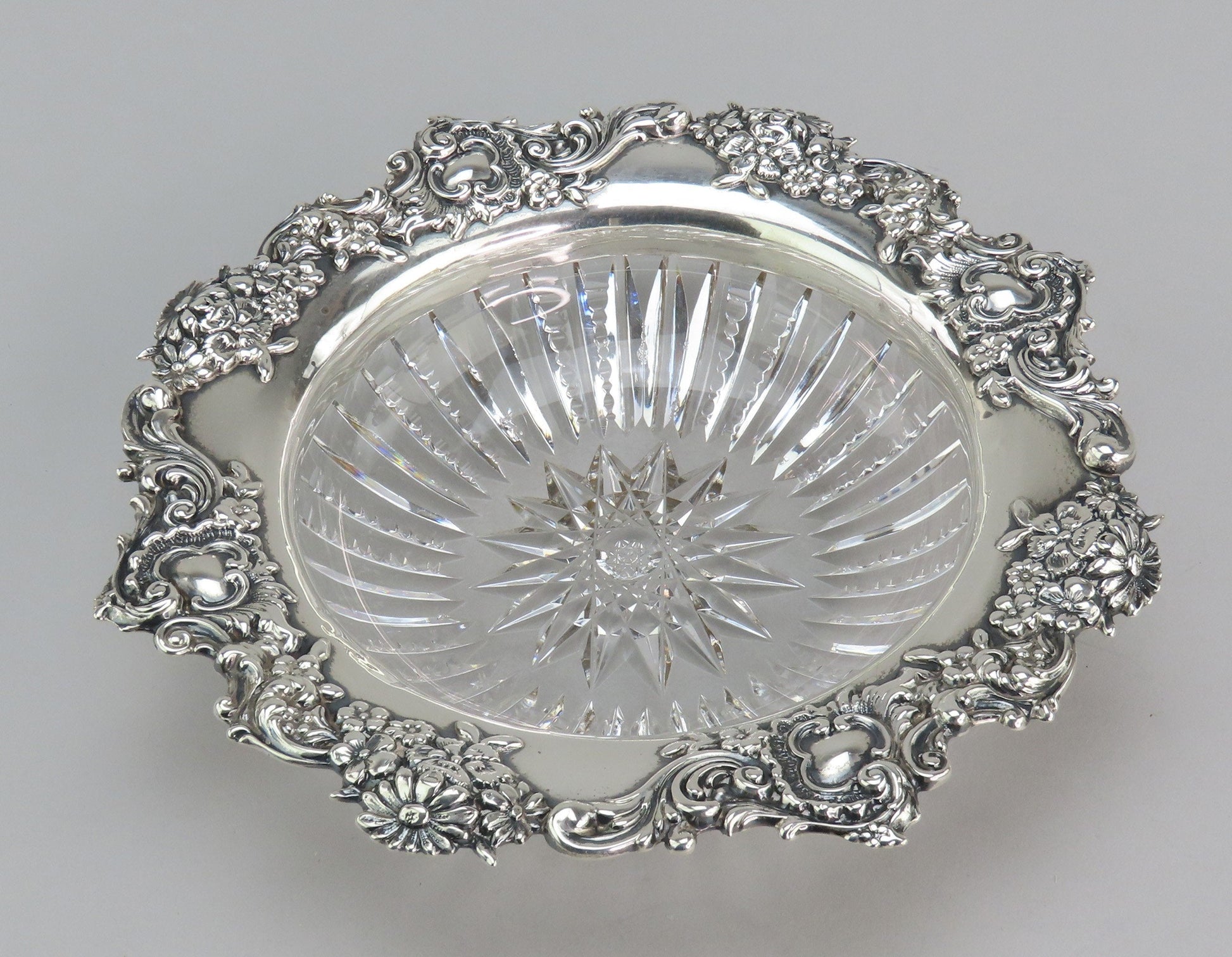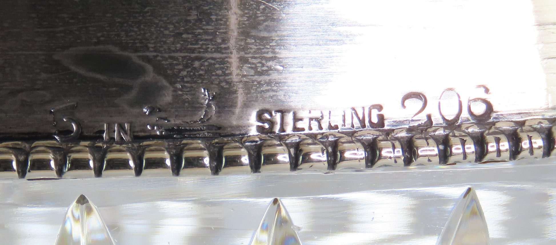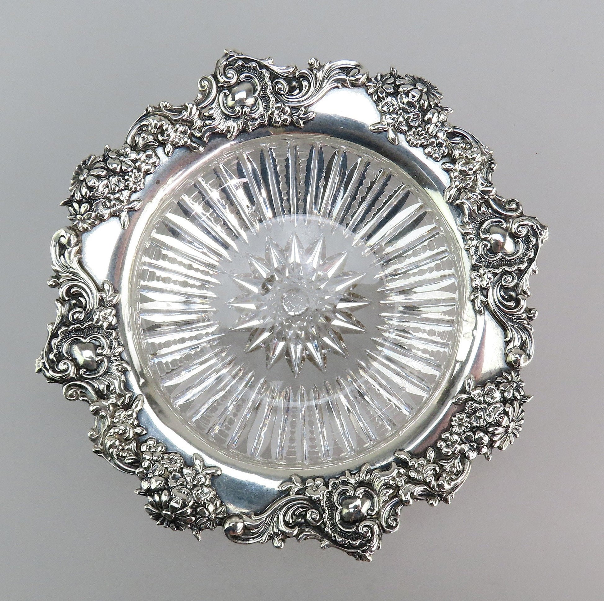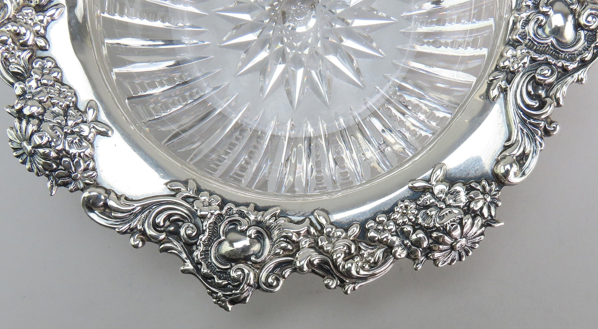 This piece is in excellent condition. The glass has some tiny nicks and one very small chip to the high points of the cutting, but nothing that is easy to notice without picking the piece up and inspecting it closely. The underside has some shelf wear, as you'd expect. The silver is in great shape, with no splits, no dents, no monograms, no monogram removals, and no repairs.