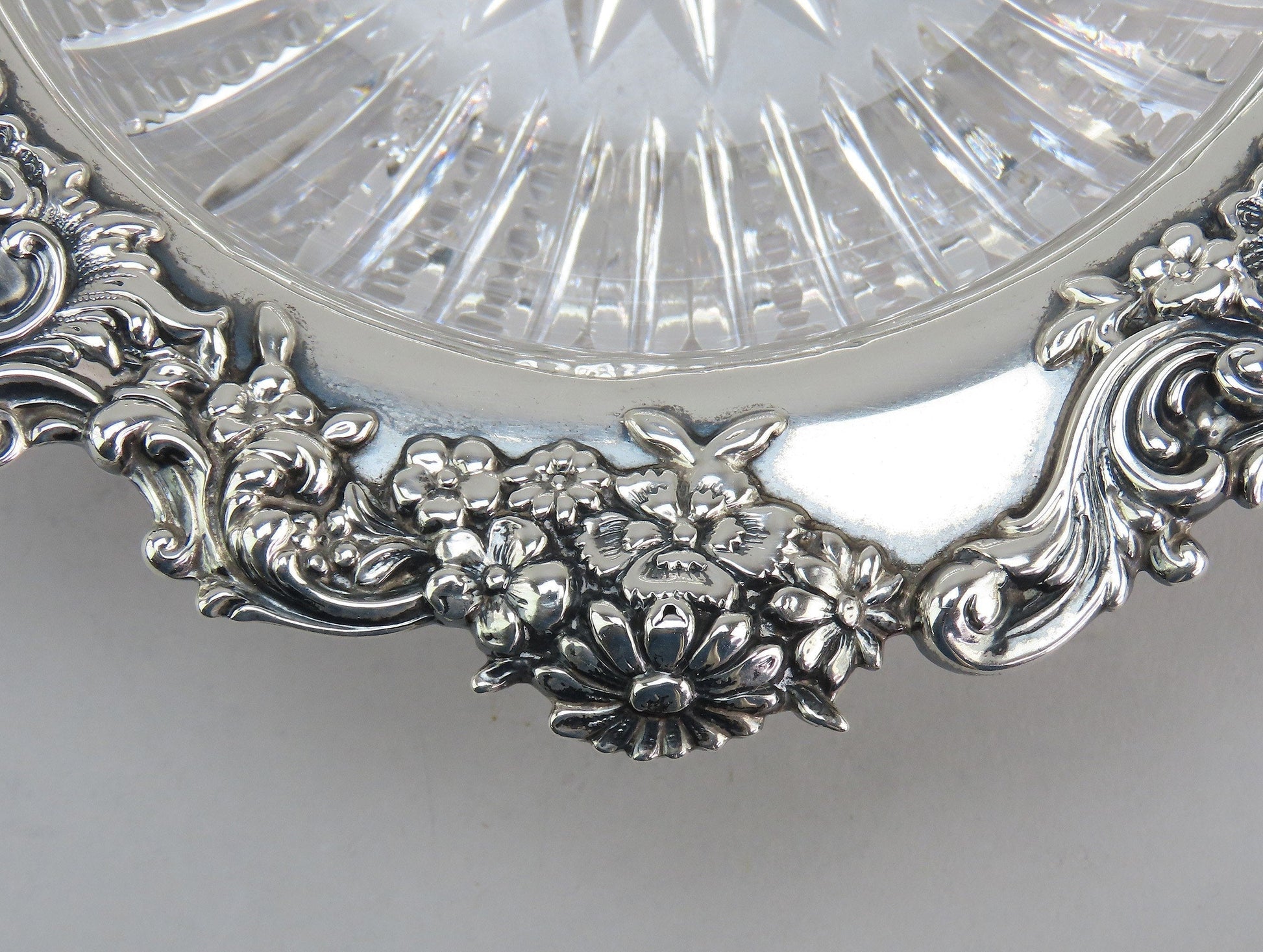 Presented is an elegant antique sterling silver and American Brilliant Period cut glass bowl or dish. This piece dates to the first quarter of the 1900s. The sterling silver rim is the work of Redlich & Co, and features a very detailed and well done design of flowers and foliate scrollwork. The bowl is heavy weight, high quality glass, finely cut with a vertical ribbed design and a hobstar on the bottom. The glass is unsigned, but the quality suggests a high end maker like Hawkes, Tuthill, Dorflinger, etc.