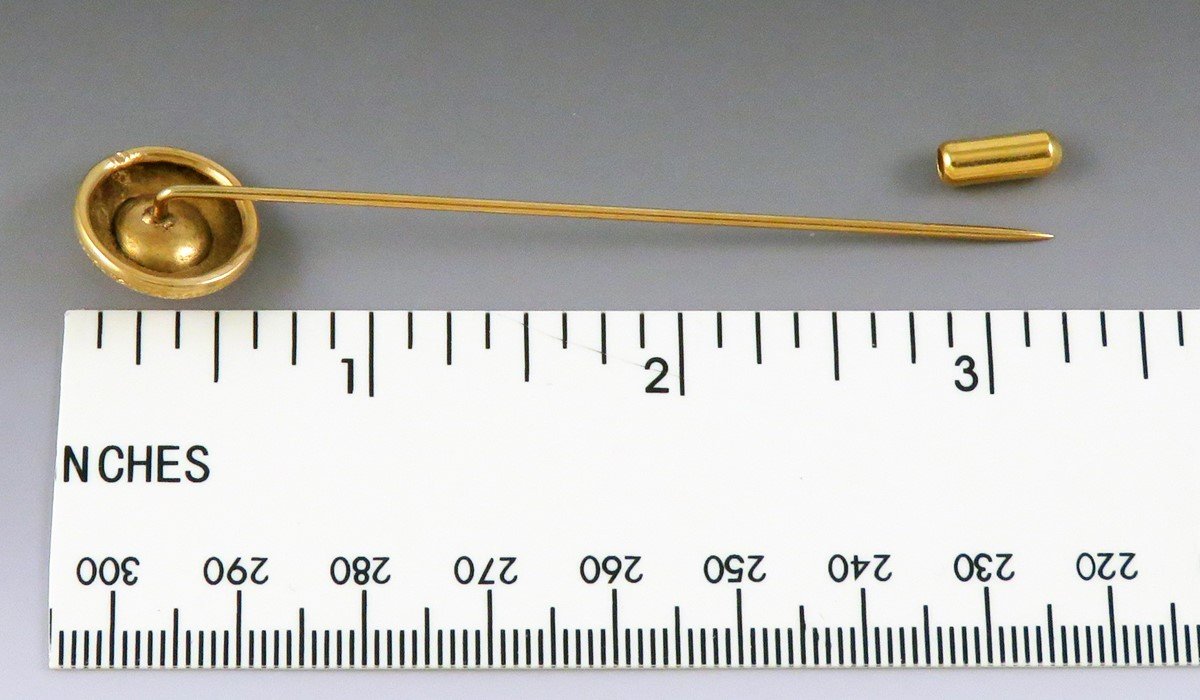 The pin is not stamped or hallmarked, but we have tested it with nitric acid and guarantee the head of the piece to be 14 karat gold and the shaft to be 10 karat gold.