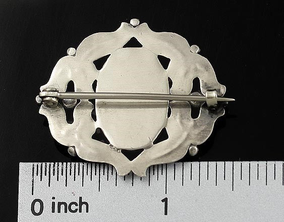 Presented is a lovely Arts & Crafts sterling silver pin. The center has a