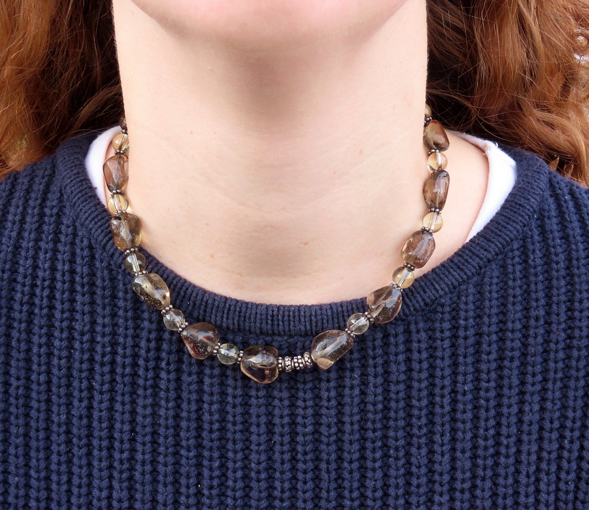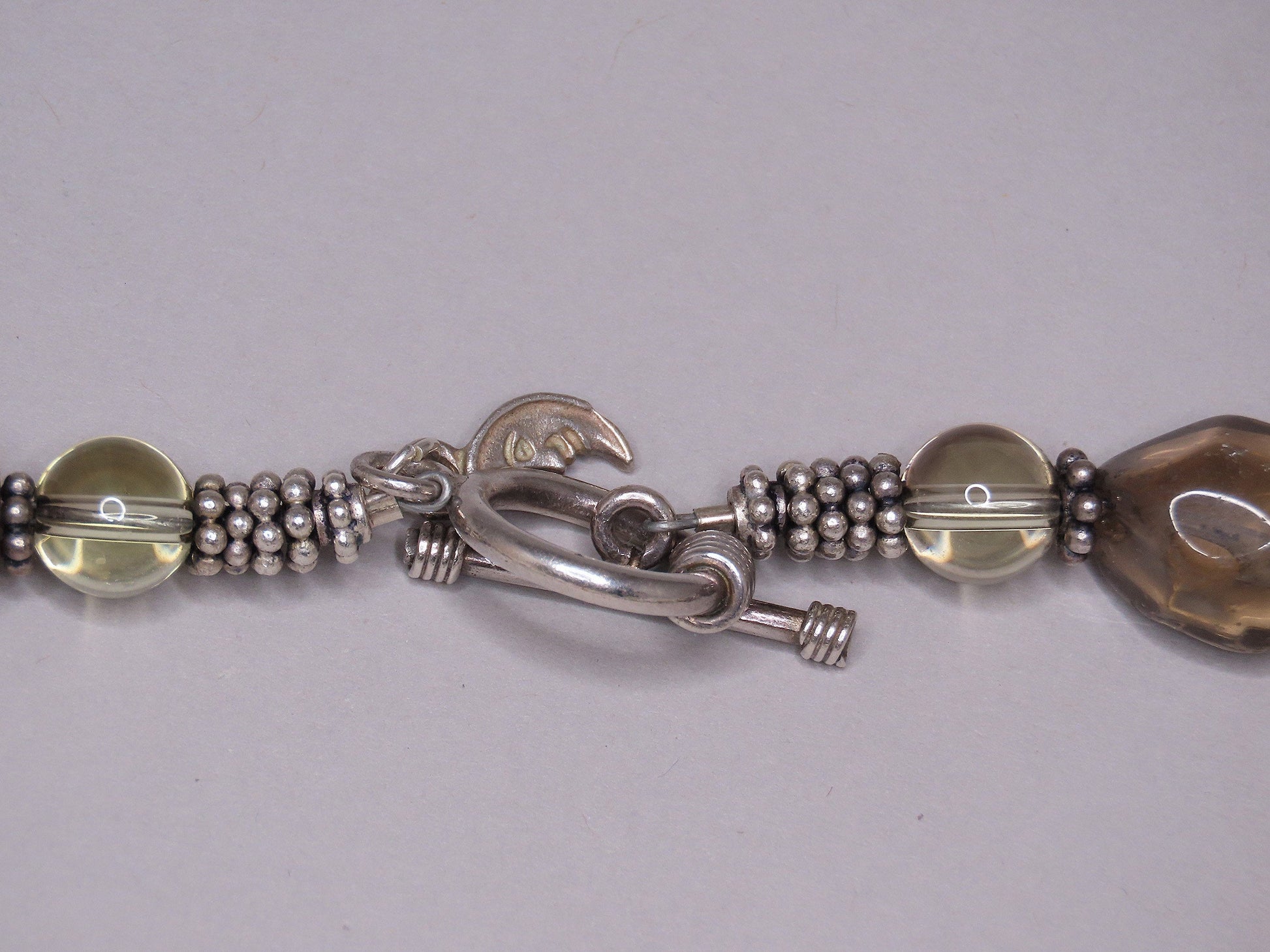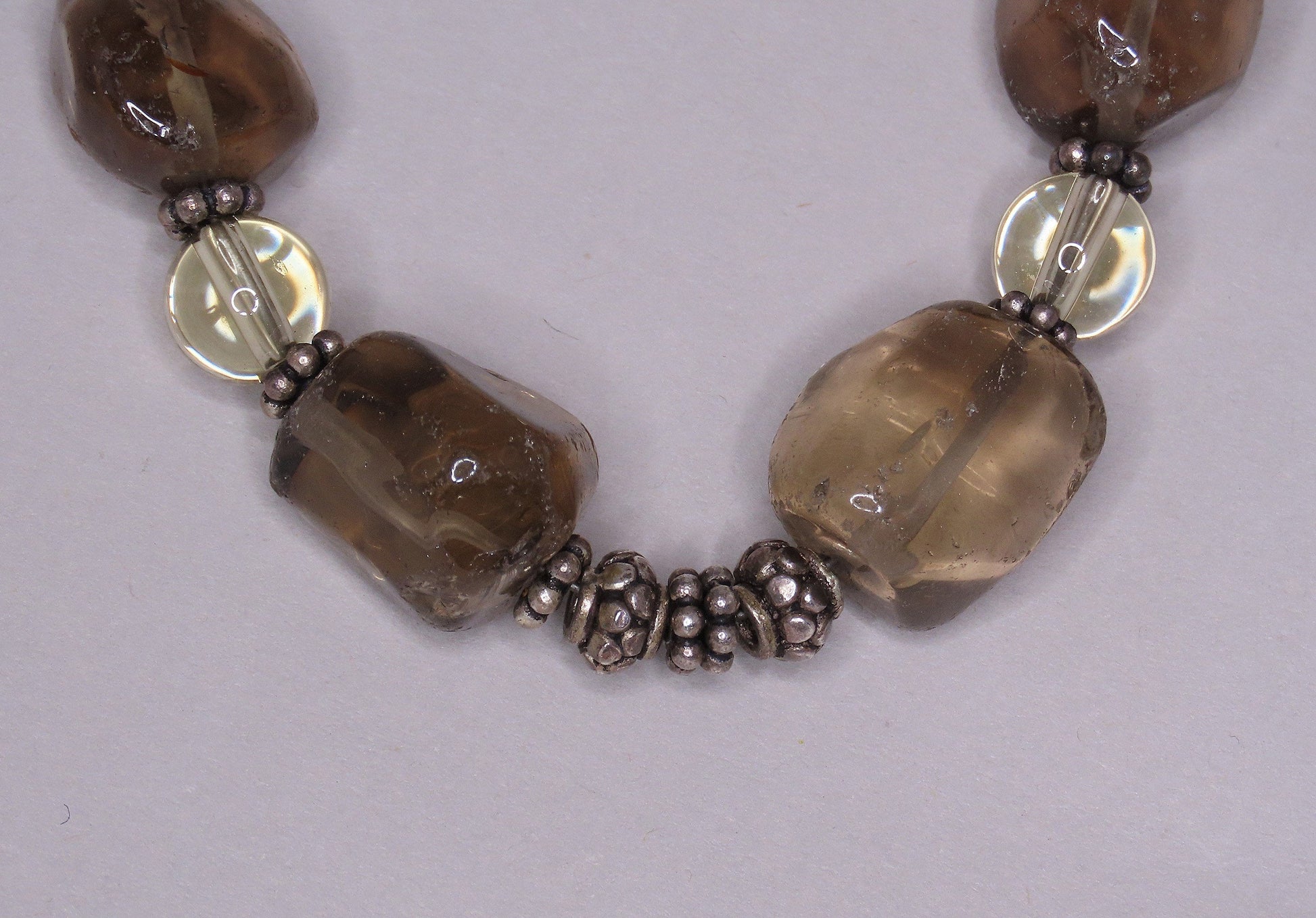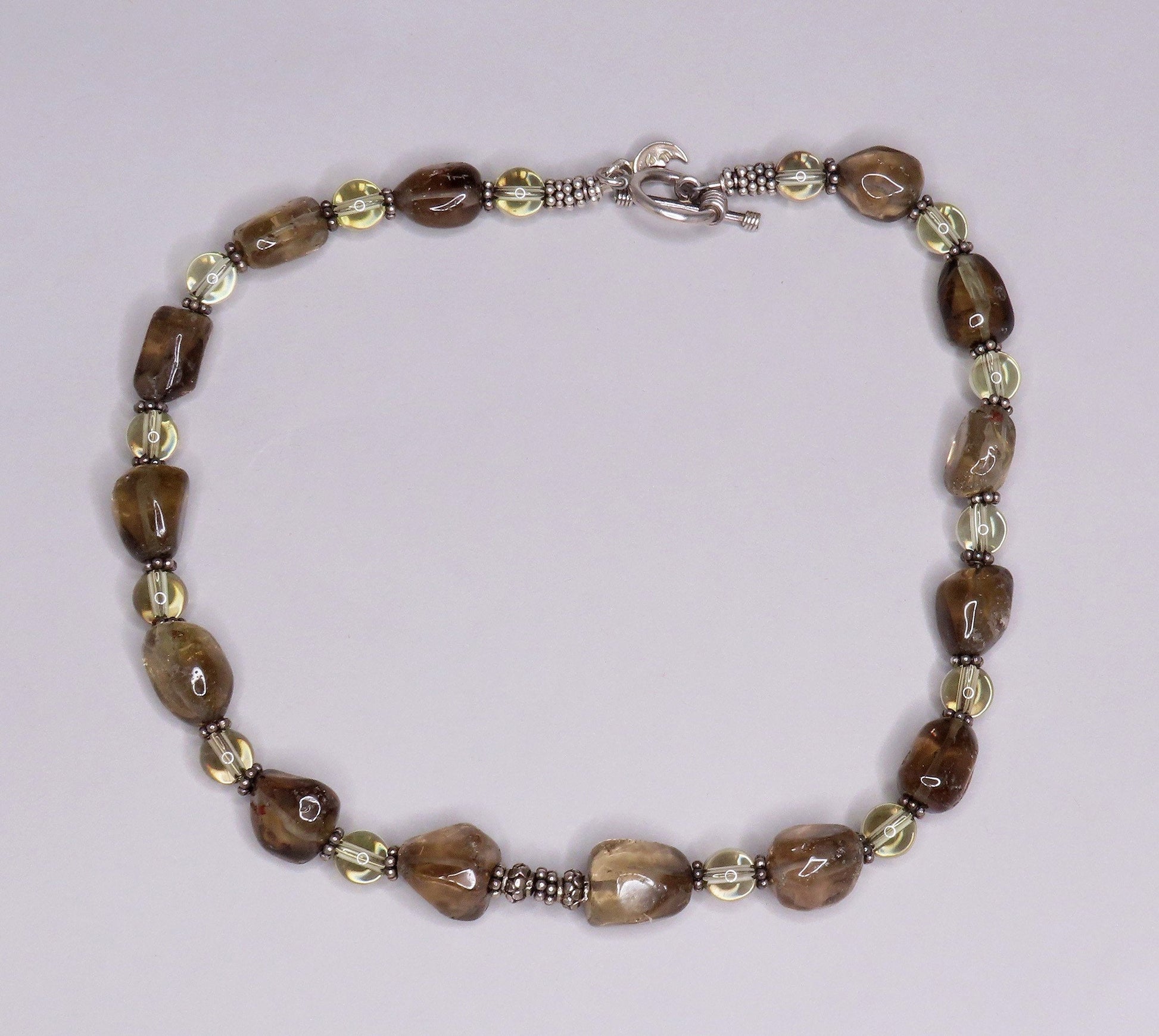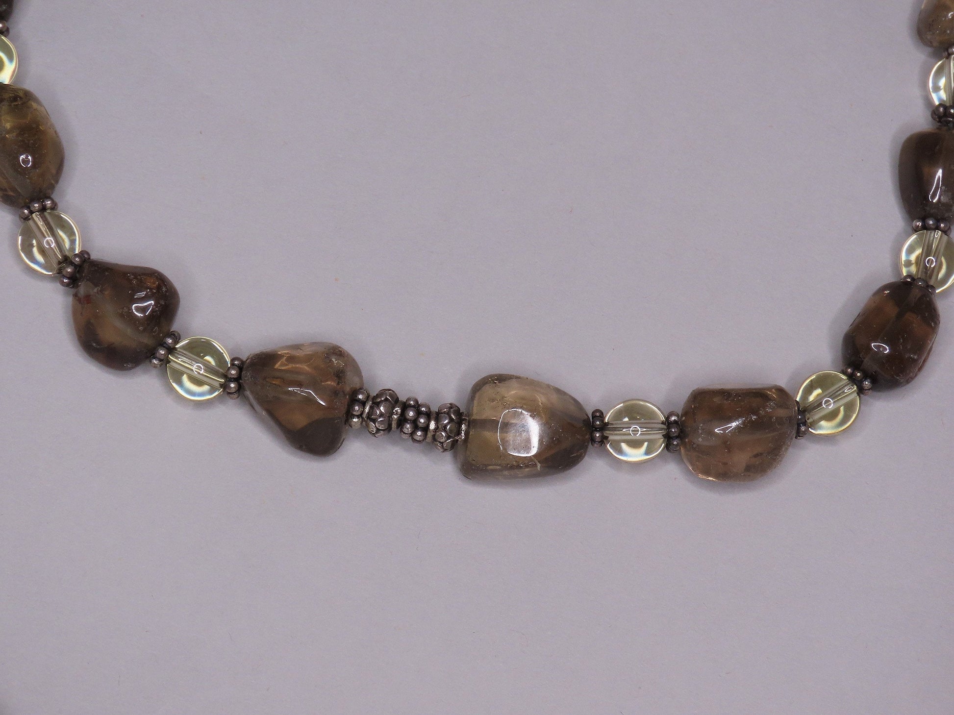 Presented is a lovely brown beaded necklace. This piece displays two different stones with decorative metal dividers between each bead. The larger beads are likely quartz. The necklace has a toggle closure with a small half-moon tag.