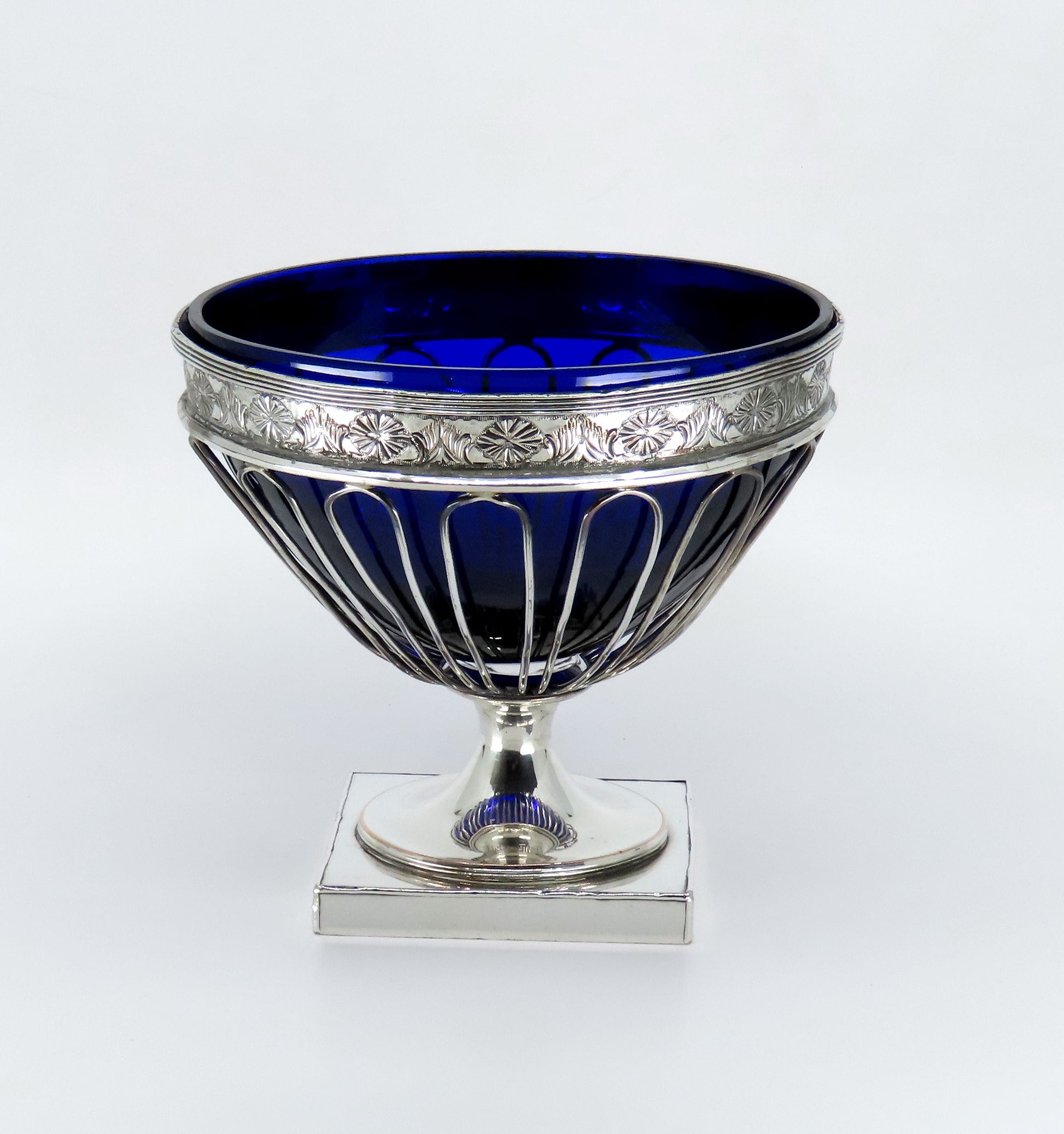 Lovely c1770-1800 Old Sheffield Fused Silverplate Cobalt Glass Sugar Basket Bowl