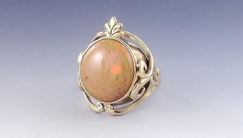 natural stone with beautiful flashes of orange, red, and green. The setting of