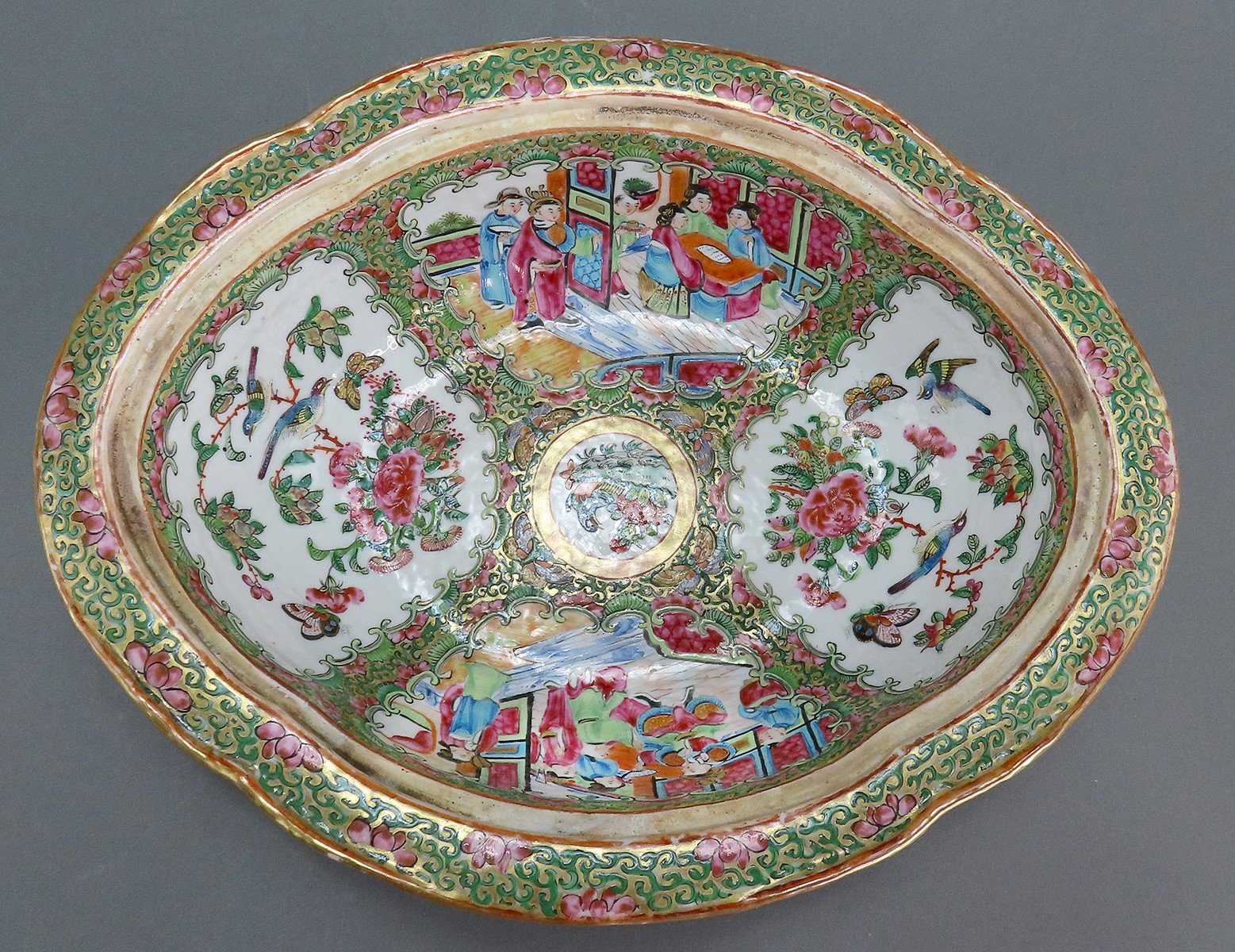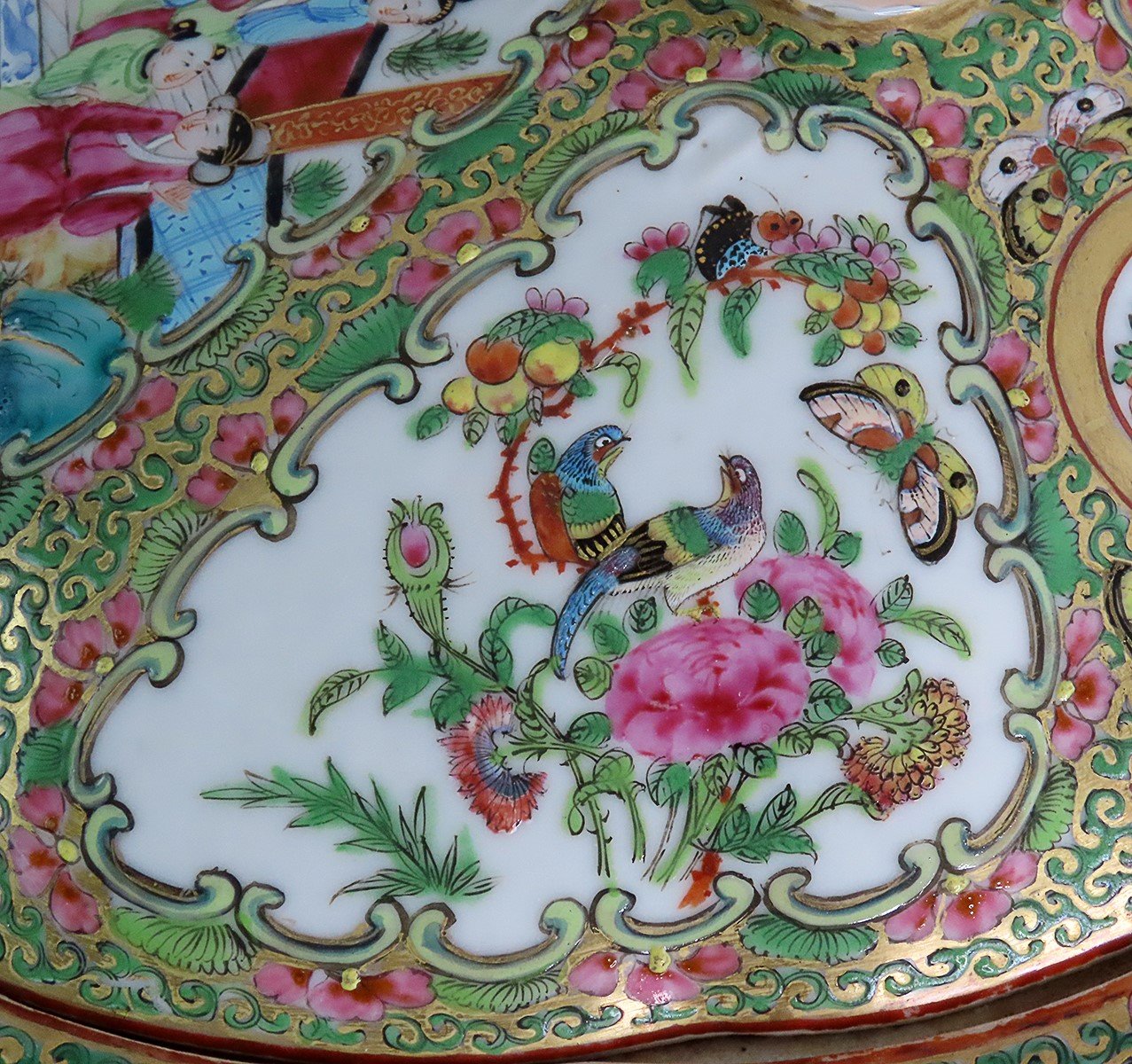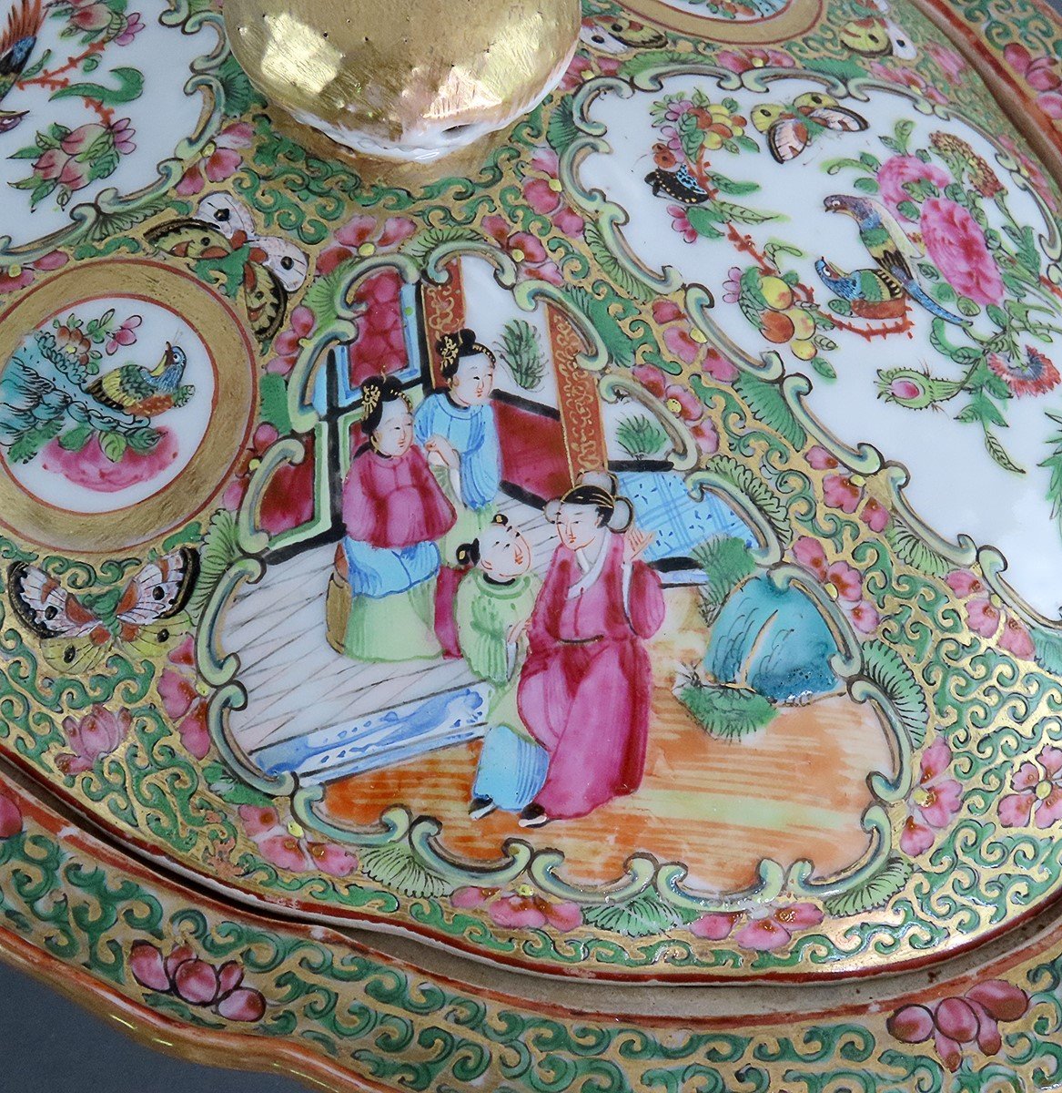 Presented is a lovely Chinese export porcelain Famille Rose Medallion covered dish, dating between 1850-1870s. The bowl is in a subtle quatrefoil form. Around the lid and the interior of the bowl, there are two intricate scenes of traditionally garbed Chinese figures alternating with two rich and colorful scenes of birds and flowers. The lid also displays two smaller round scenes of birds and flowers. The lip of the dish has a border of green scroll-work alternating with flowers against a gilt background; this pattern also in between all the scenes. The exterior of the piece displays floral clusters on each of the quatrefoil sides.