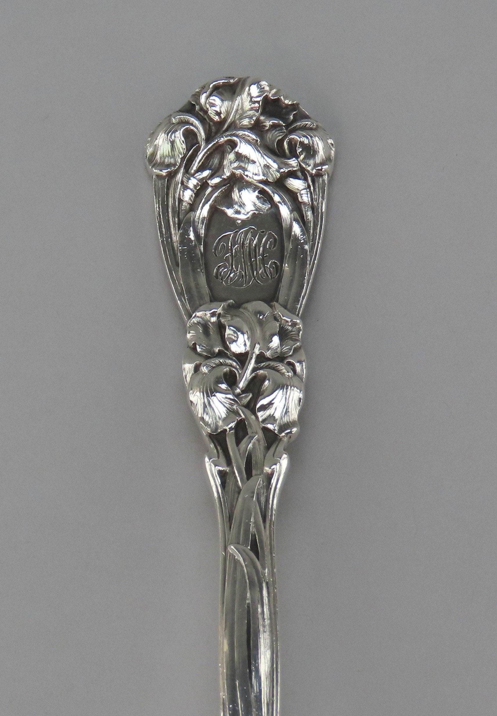 Presented is a lovely sterling silver asparagus server from Durgin. This piece is in the Iris pattern, which was patented in 1900. This pattern displays Art Nouveau style iris flowers and leaves with a twisting threaded pattern on the serving end. There is a monogram on the front cartouche, FMH, is a flowing script.