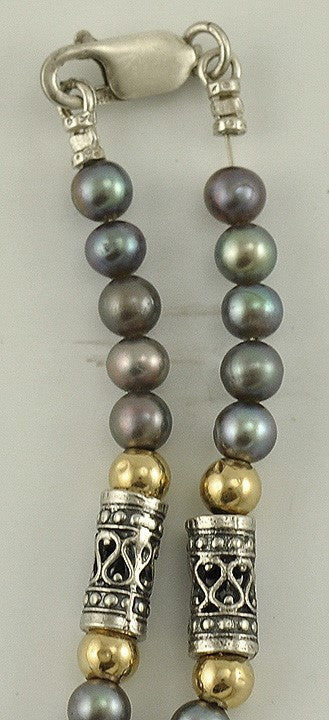 Presented is a 14k yellow gold, sterling silver and freshwater pearl