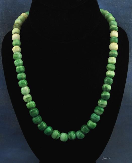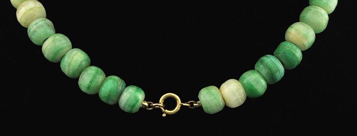 Presented is a green and white genuine stone beaded necklace. The clasp is gold filled and is marked as such. It has a nice weight to it.