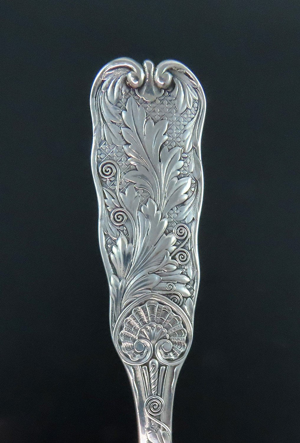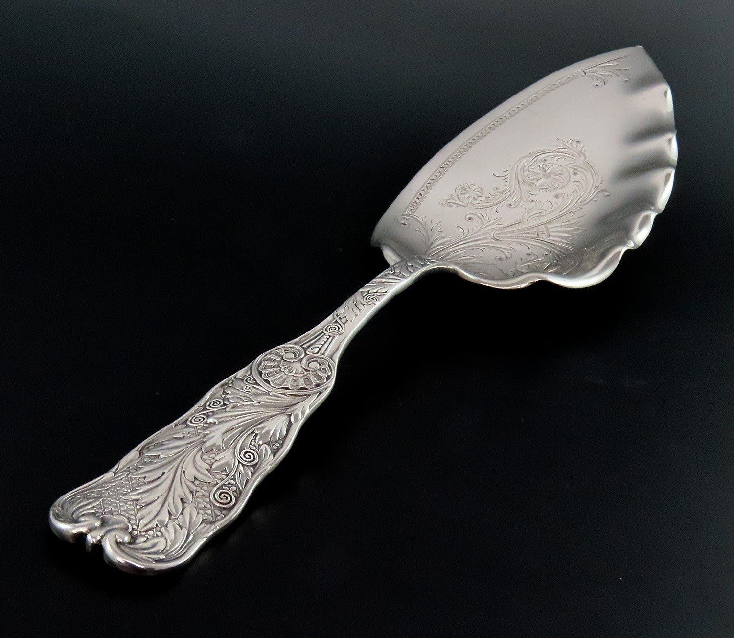 Presented is a lovely sterling silver fish server from Gorham, although can be used for many other foods. This large and heavy piece is in the St. Cloud pattern, which was patented in 1885. This pattern displays fancy leaves and scroll along the handle. The serving end has fancy engravings that match the handle pattern well. The back of the handle is monogrammed “HFG” in a flowing script.