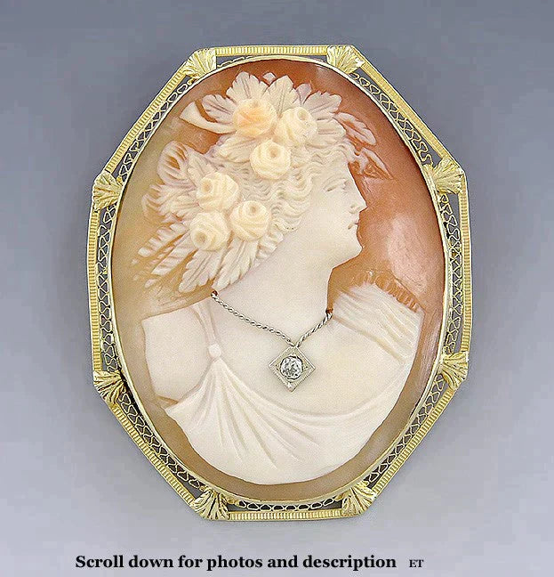 Presented is a very large cameo 14K gold pin. The shell carving was done in Italy between 1910-1920s, and the gold filigree bezel setting was made in America around the same time. The beautifully carved piece depicts a lovely young lady with roses in her hair and a chic sleeveless dress with straps. She wears a real white gold necklace set with a nice 3 point sized diamond. The octagonal filigree setting has lovely little shell accents at each corner.