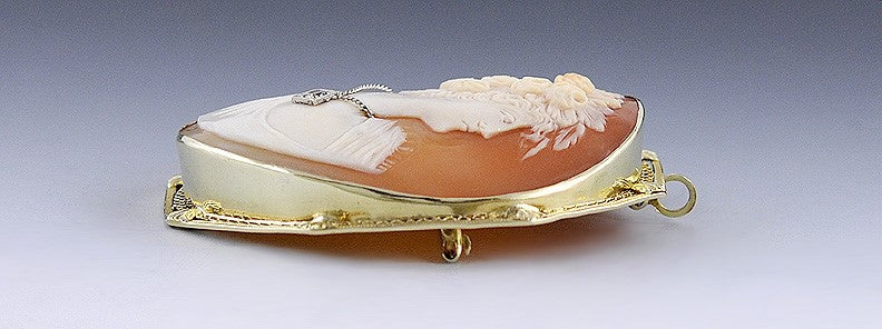 Lovely Hand Carved Cameo Young Woman Diamond 14k Gold Pin Brooch Pendant