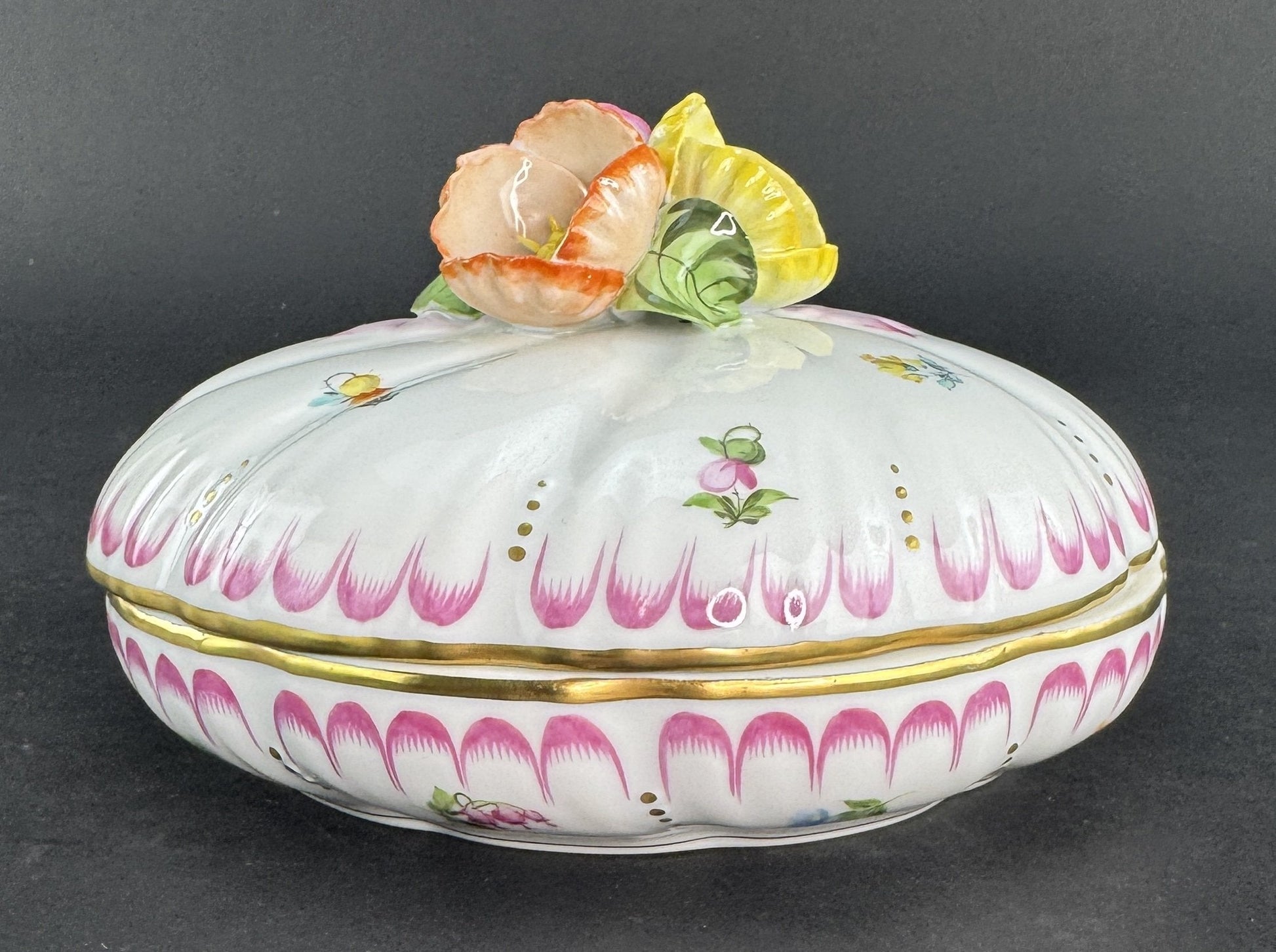 Presented is a beautiful Herend porcelain trinket box or bonbonniere/candy dish. The dish is made in a lovely scalloped design with a pink border, fine gold gilt rims, and delicate floral decoration around the lid. The finial of the lid is made in the form of three wonderfully detailed fully three dimensional flowers, in pink, orange, and yellow, with delicately sculpted pistils of contrasting colors in the centers and ruffled edges to the petals. The quality of all the decoration is exceptional, and all done by hand.