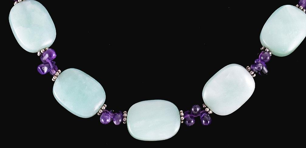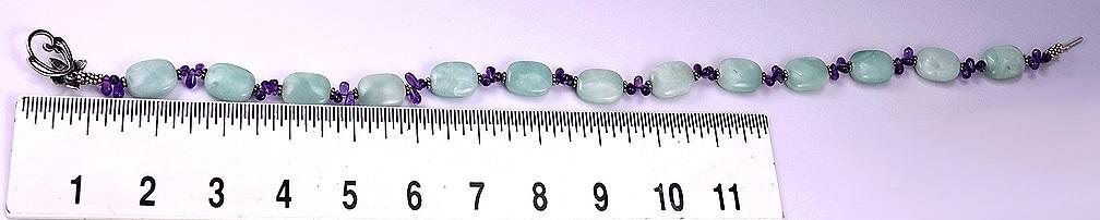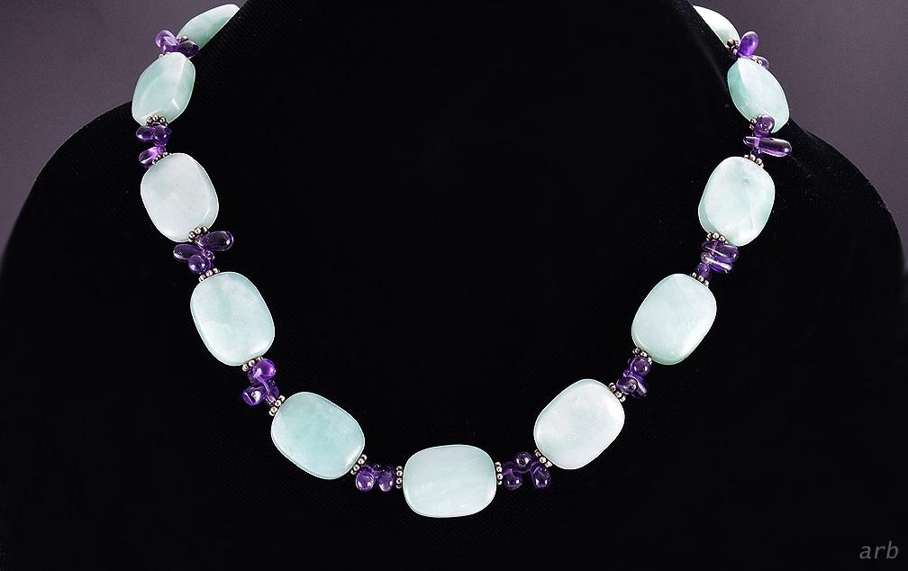Presented is a lovely necklace made up of polished jade or agate stones in a light, fresh green, connected with sterling silver links and groups of three amethyst stones. The light green and the purple of the amethysts make for a great color combination! The necklace is very nice quality. It measures 17 ½ inches long and has a toggle clasp which works well. The clasp is marked for sterling silver and has a maker's stamp.