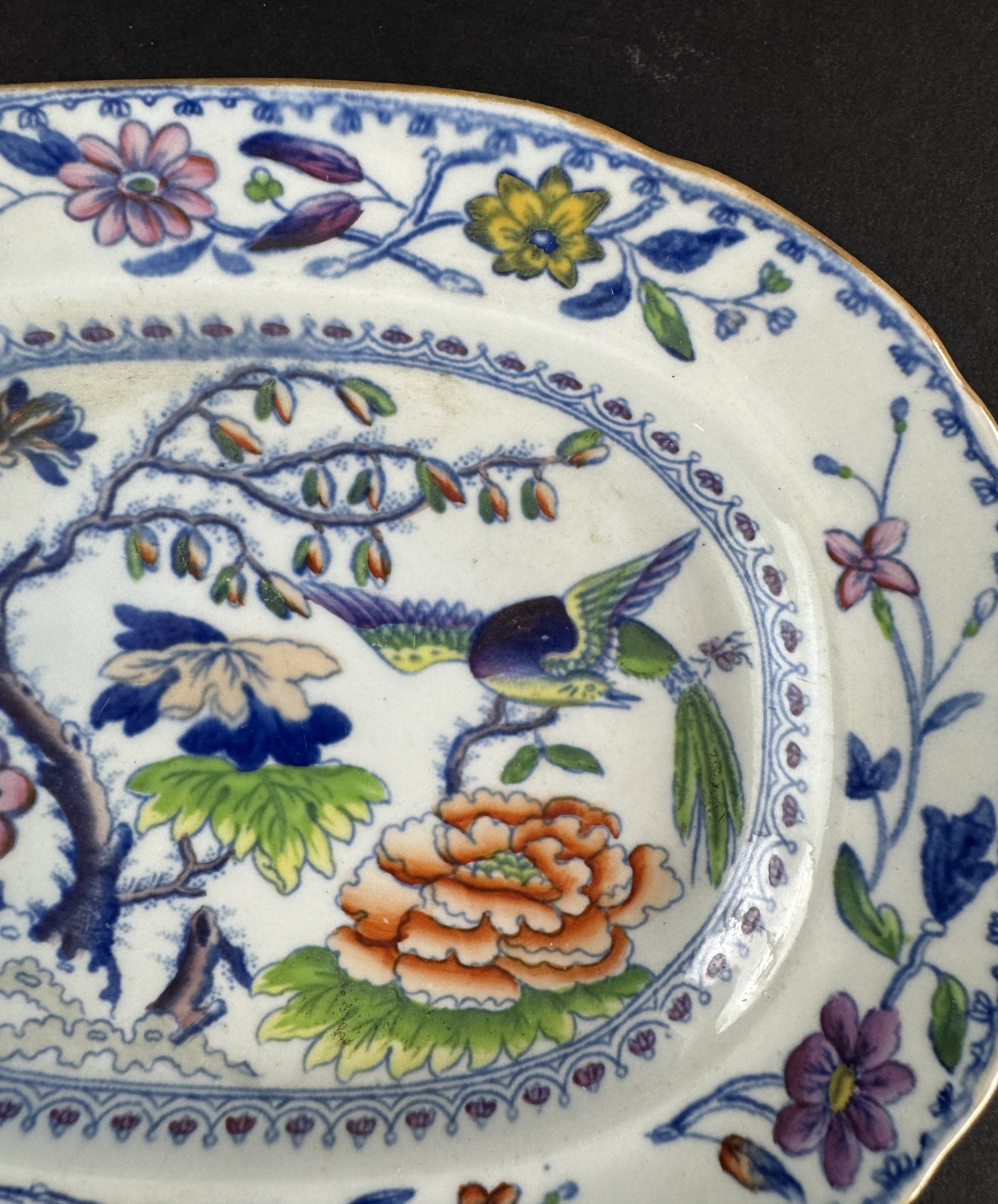Presented is an excellent quality pair of antique Davenport stone china oval dishes, dating to circa 1815-1820. These dishes are made in the highly sought after Flying Bird pattern, which is a vibrant and colorful Chinoiserie pattern depicting a long tailed bird in flight surrounded by stunning flowers and foliage. The palette is a very eye-catching array of blues, greens, orange, purple and pink shades, with fine gold gilt detailing. This pattern would later be produced by Mason's Ironstone as well as other fine English makers. We have many additional pieces in this pattern from the same estate including some particularly rare examples, which you can find by searching “Flying Bird” in our store.