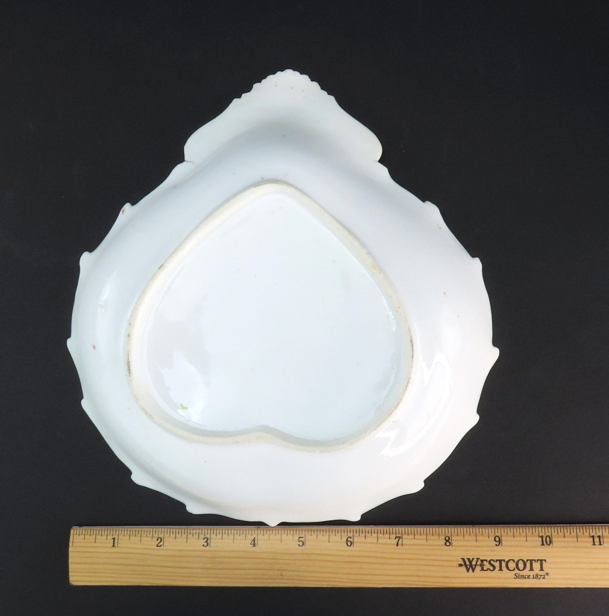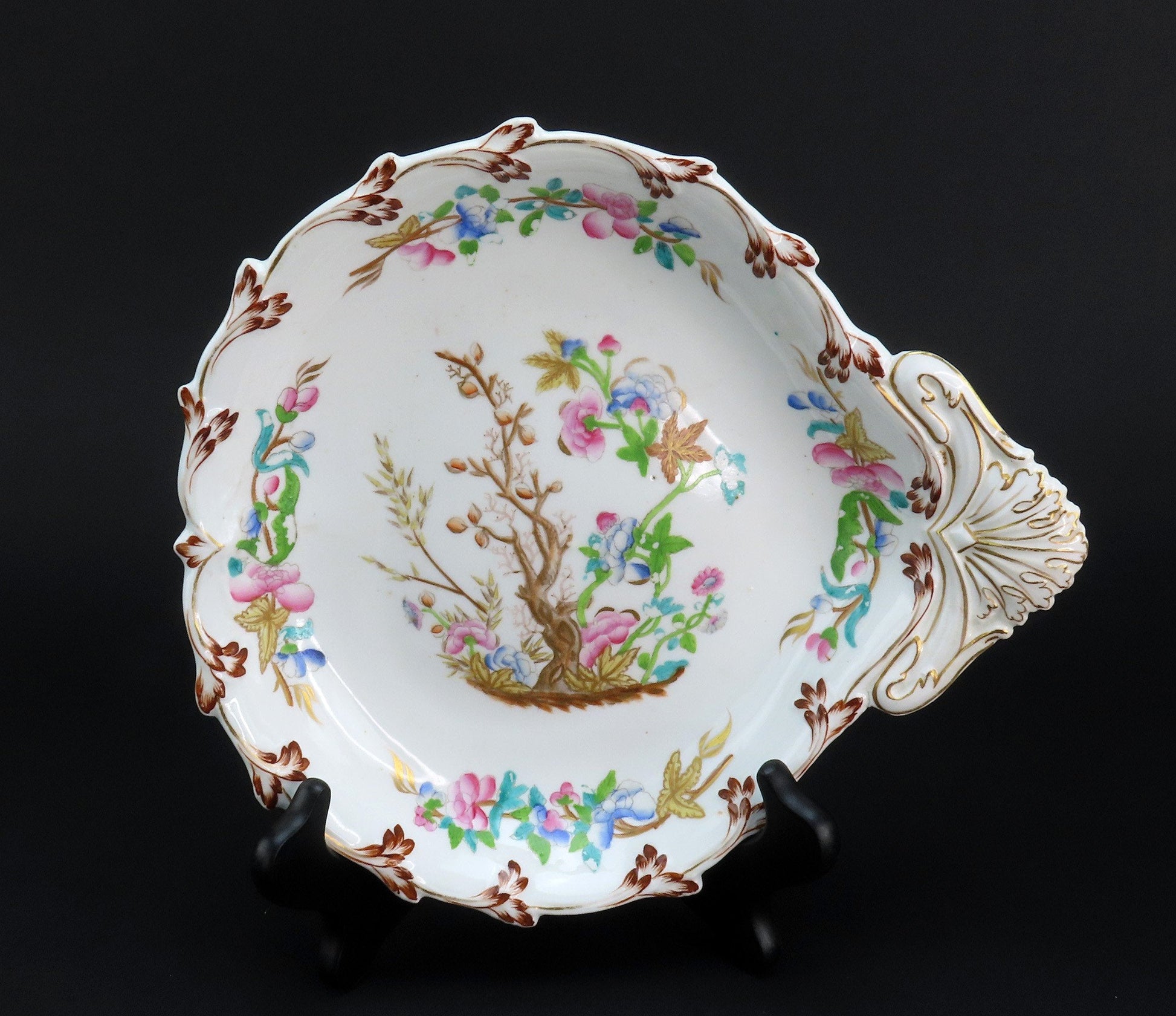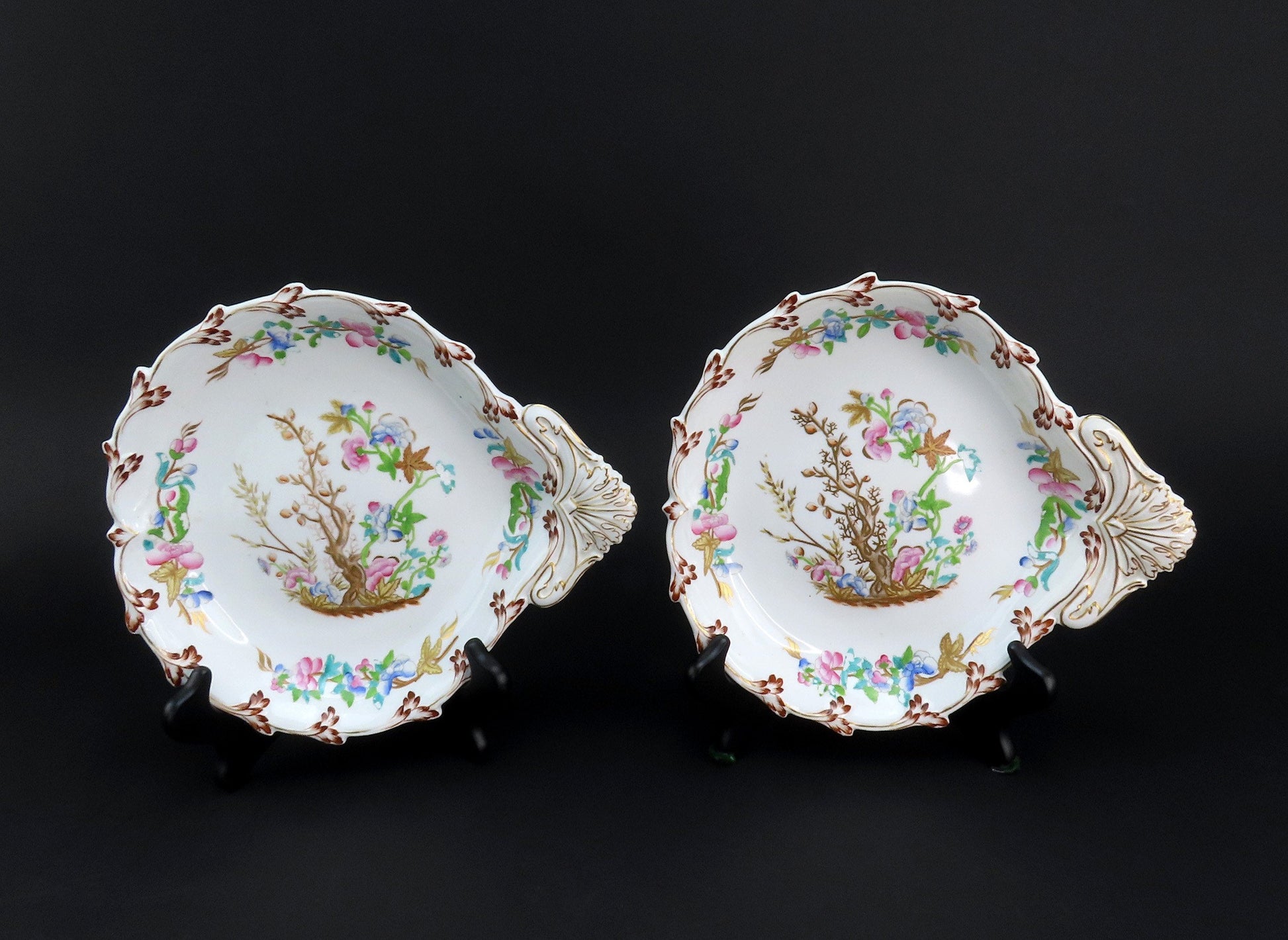Presented is a lovely pair of porcelain serving dishes. This pair is likely English from the 1835 to 1875. The plates are decorated with hand-painted flowers with a branch in the center scene. Both have a slight heart shape with a handle at the base. The edge displays a brown leaf decoration and gilded details on the handle.
