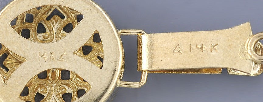 Both parts of the clasp are stamped 14k with a maker's mark we unfortunately do not recognize.