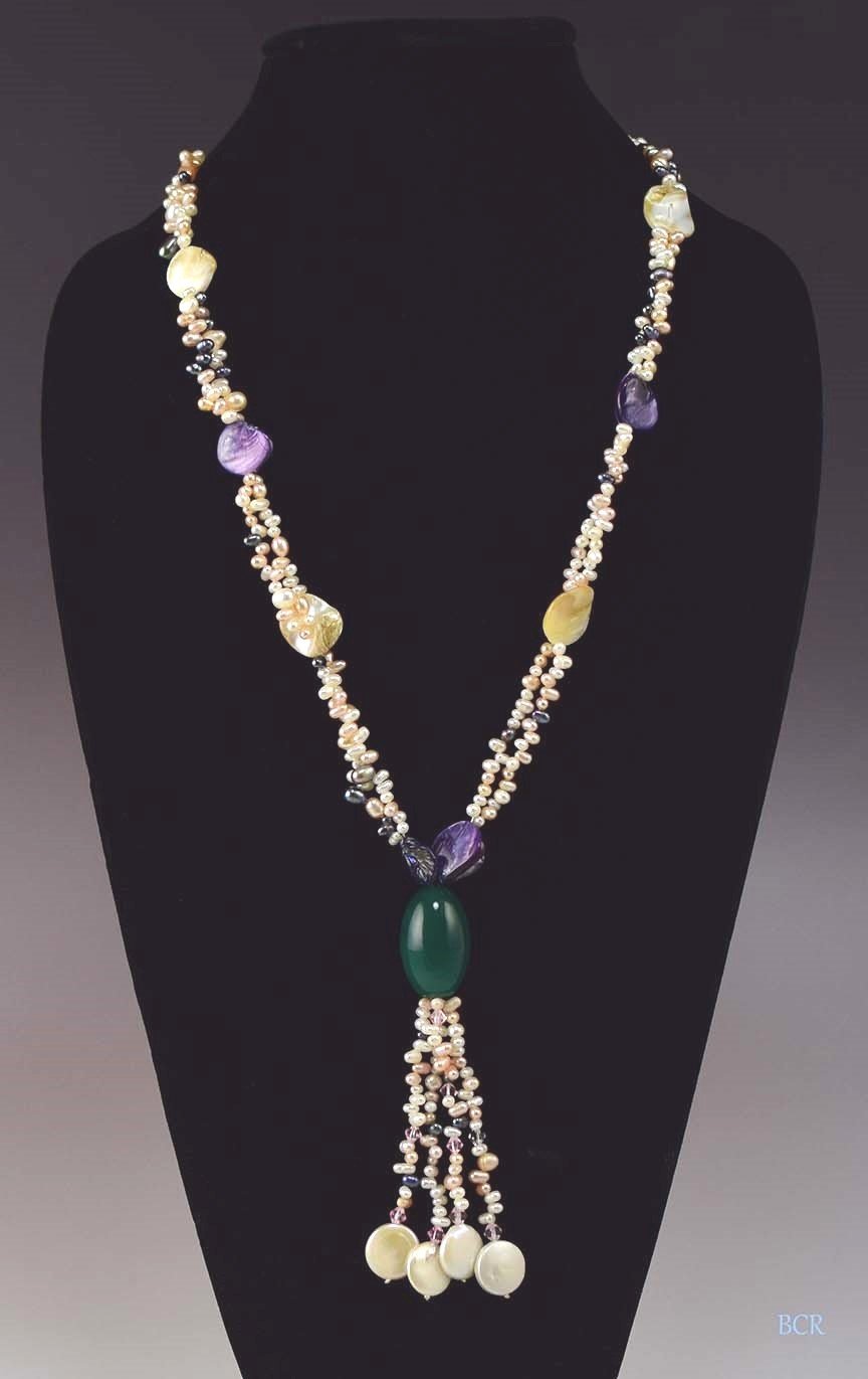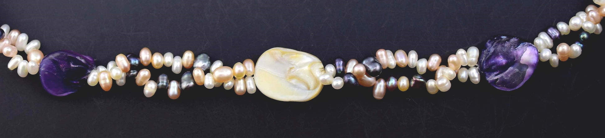 The alternating spacers connecting these strands are made of dyed purple and white mother of pearl beads.