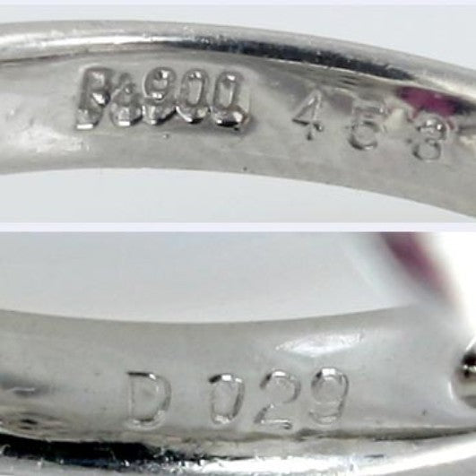 The ring is marked Pt 900 for Platinum on the inside of the band. The band is also stamped D029. This may indicate that the total diamond weight is 29 points.