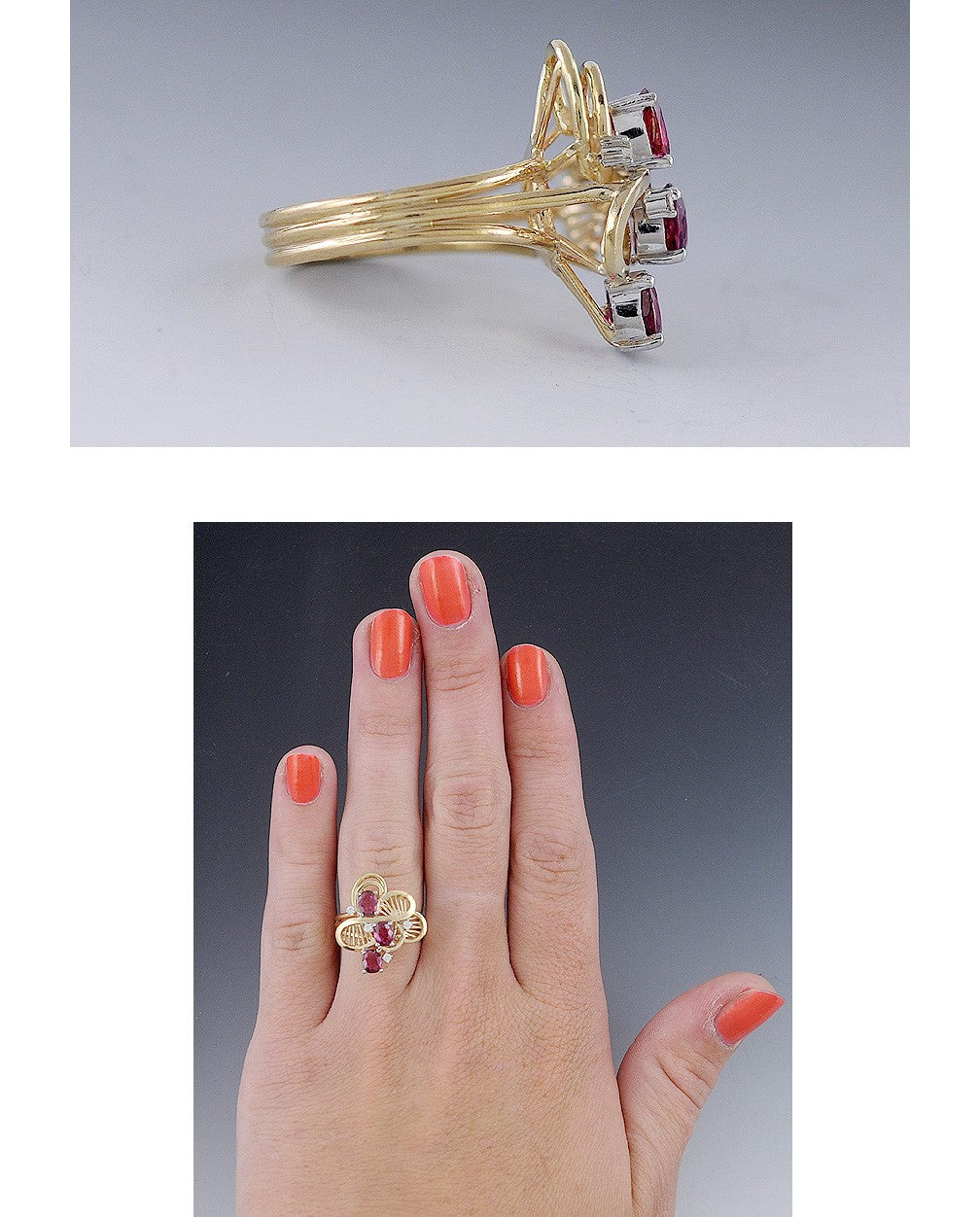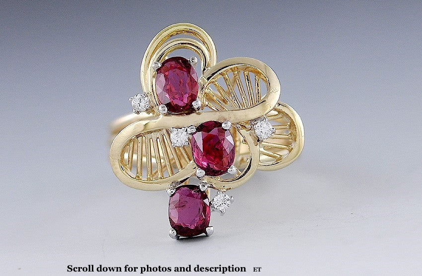 Presented is a lovely ruby and diamond ring in 14 karat gold. The ring is set with three oval cut rubies of about 35-40 points each in size, for a total ruby weight of 1.05 to 1.20 carat. Accenting the rubies are four modern brilliant cut diamonds of about 1.5 points each in size, very vibrant and dazzling stones. The stones are set in white gold, so they really 'pop.' The gold setting itself is done in an interesting design of loops with openwork.