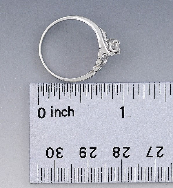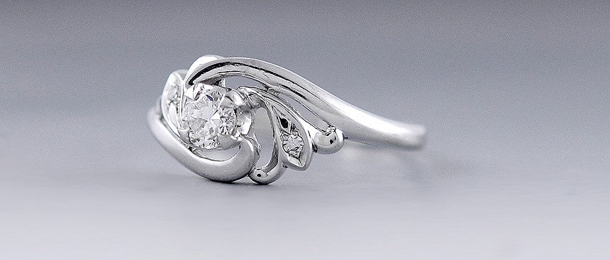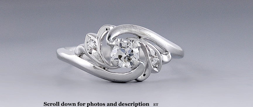 Presented is a lovely diamond ring in 14 karat white gold. This ring dates to around the 1930s and is likely of American make. The ring is done in a hurricane or whirlpool sort of spiral, with a nice mine cut diamond in the center and an accent diamond on either side. The center diamond is at least 30 points, maybe a third of a carat, of I-1 clarity and H/I color. This is a beautiful vintage ring in an interesting design, and very flattering on the hand too.