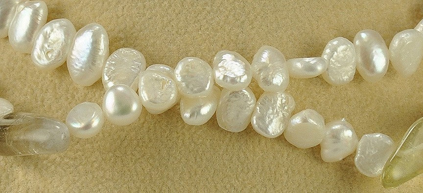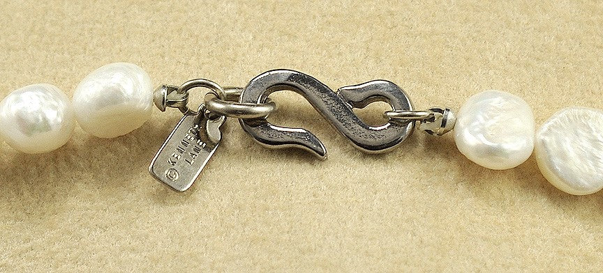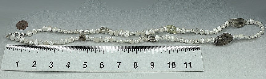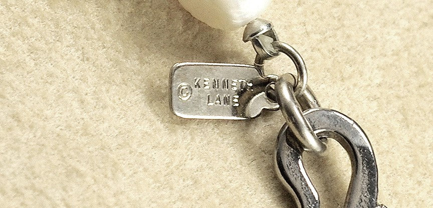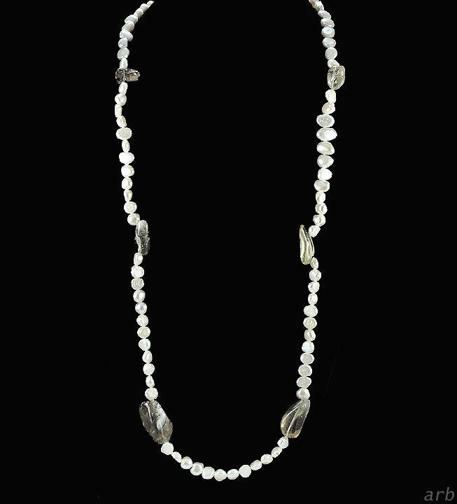 Presented is a lovely, long, trendy necklace with real pearls and grayish-clear stones, made by Kenneth J. Lane.