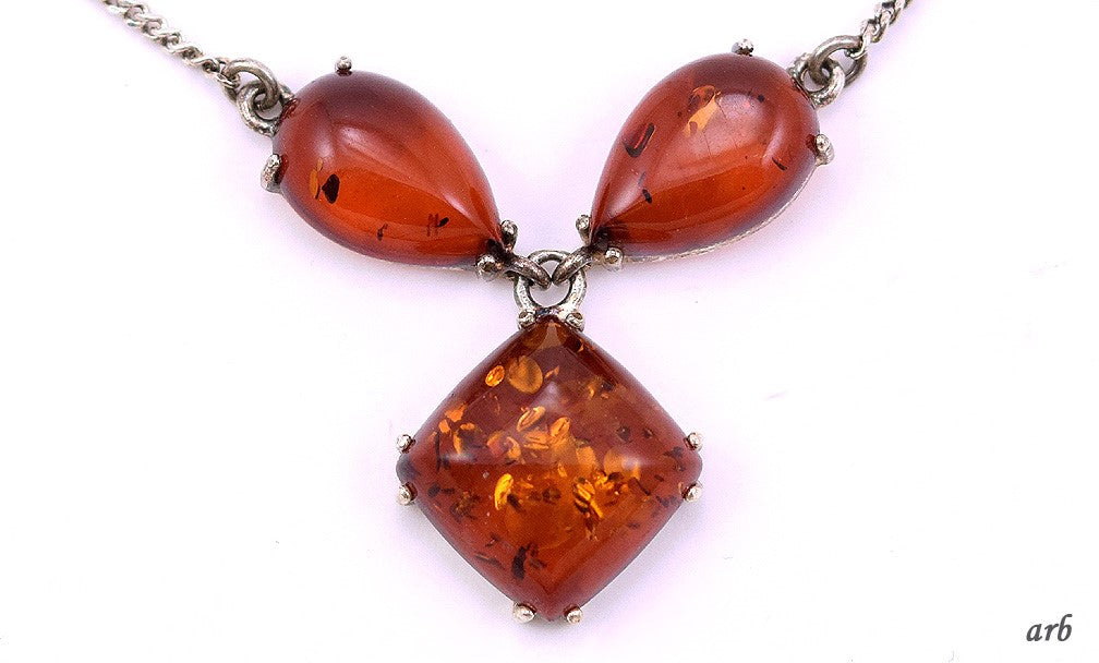 Presented is a wonderful vintage sterling silver and amber lavalier necklace. This necklace is wonderfully designed! The clasp and setting are sterling silver, and are marked as such. It has a three gorgeous natural amber stones. The top two are teardrop shaped, and the bottom is square shaped, mounted at an angle.