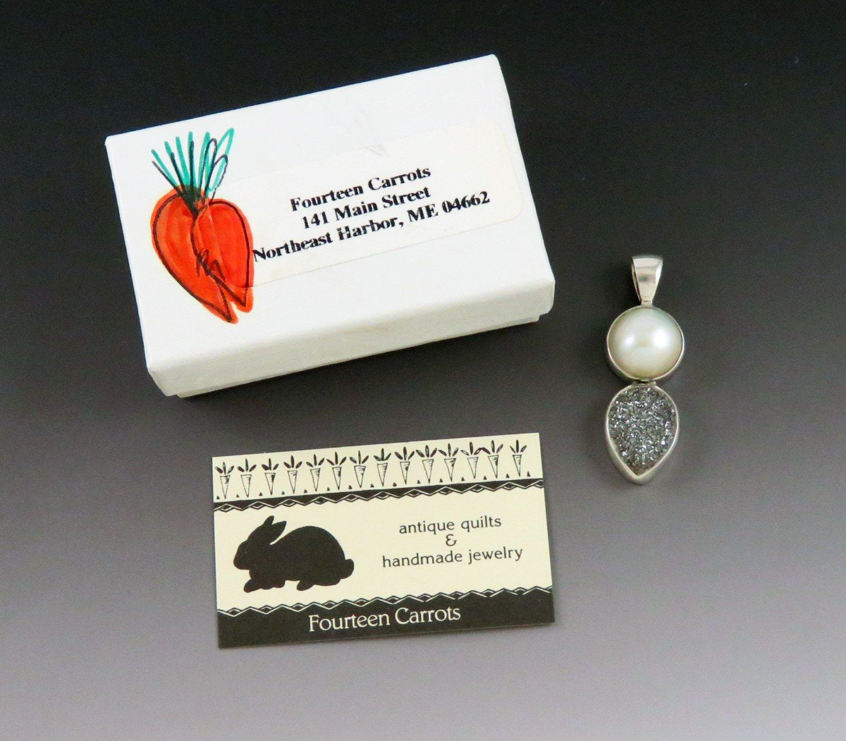 Presented is a lovely vintage sterling silver, mabe pearl and drusy quartz pendant. This piece came to us with its original box and card from Fourteen Carrots, an artisan jewelry shop in Maine, but unfortunately unlike other pieces we have acquired from the same shop, the artisan is not listed on the card. However the stones are identified on the back, handwritten, as mabe pearl and drusy quartz. The mabe pearl is about 12.2 millimeters in diameter, bezel set above a teardrop shaped panel of sparkly drusy quartz. The bail measures about 7 by 4.5 millimeters, so it will accommodate a wide variety of chain or cord styles/sizes.