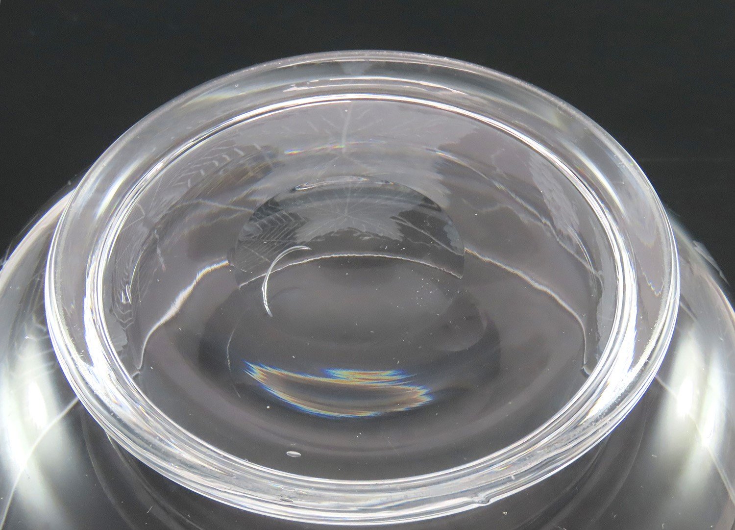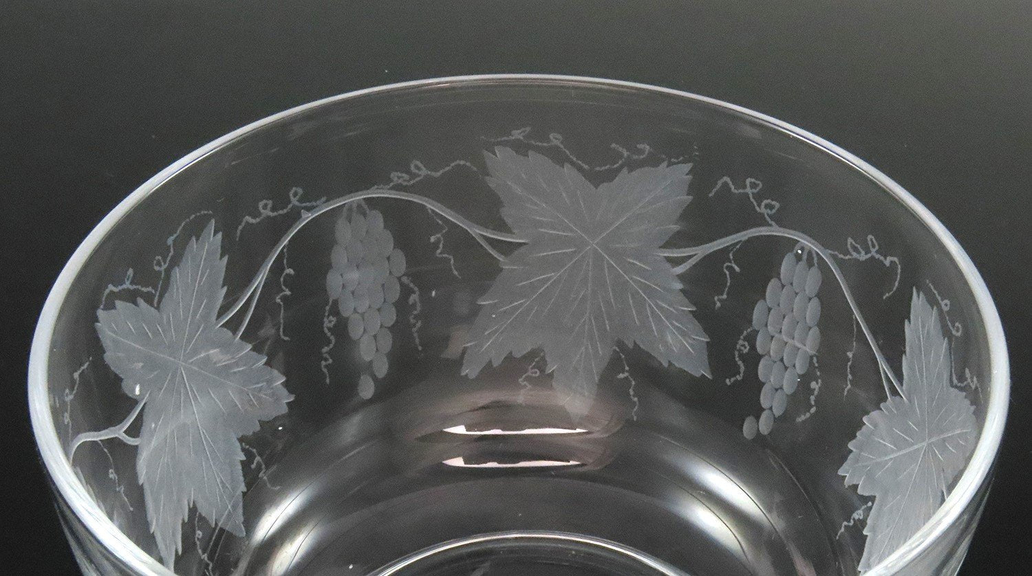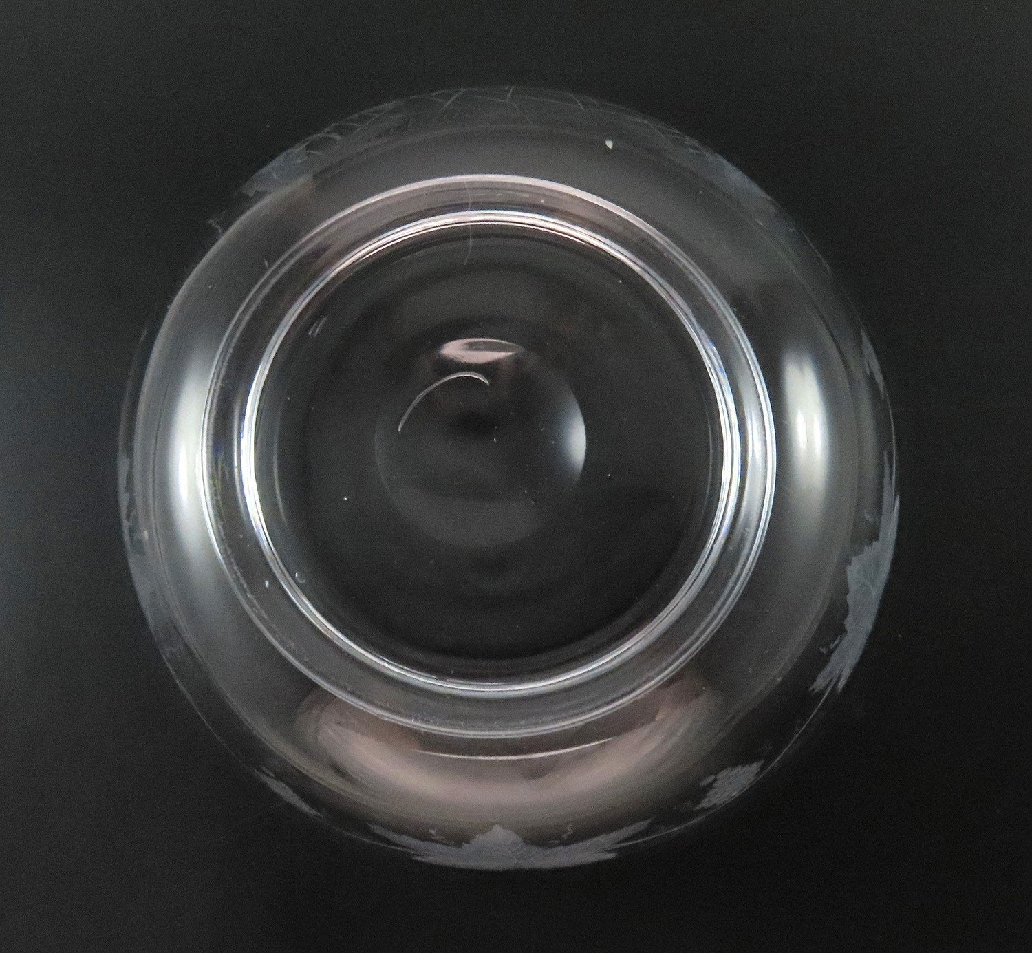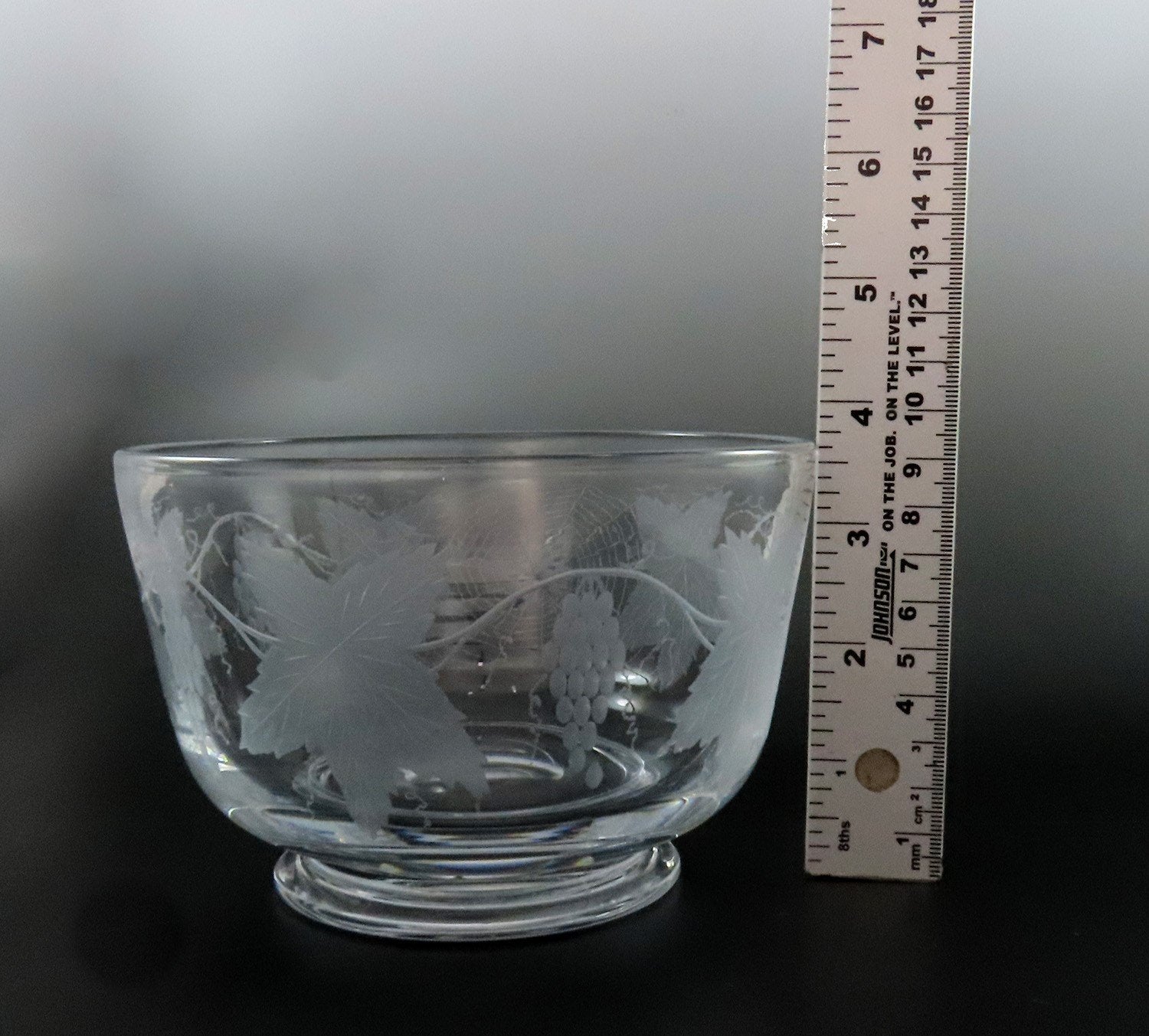 Presented is a lovely vintage Pairpoint glass bowl, dating to around the 1970s. This bowl is beautifully decorated around the side with acid etched grape cluster, vine and leaf designs, as well as a little spiderweb with a trapped butterfly, so I believe this may be the Colias pattern. The underside has a nice polished pontil mark, as you'd like to see.