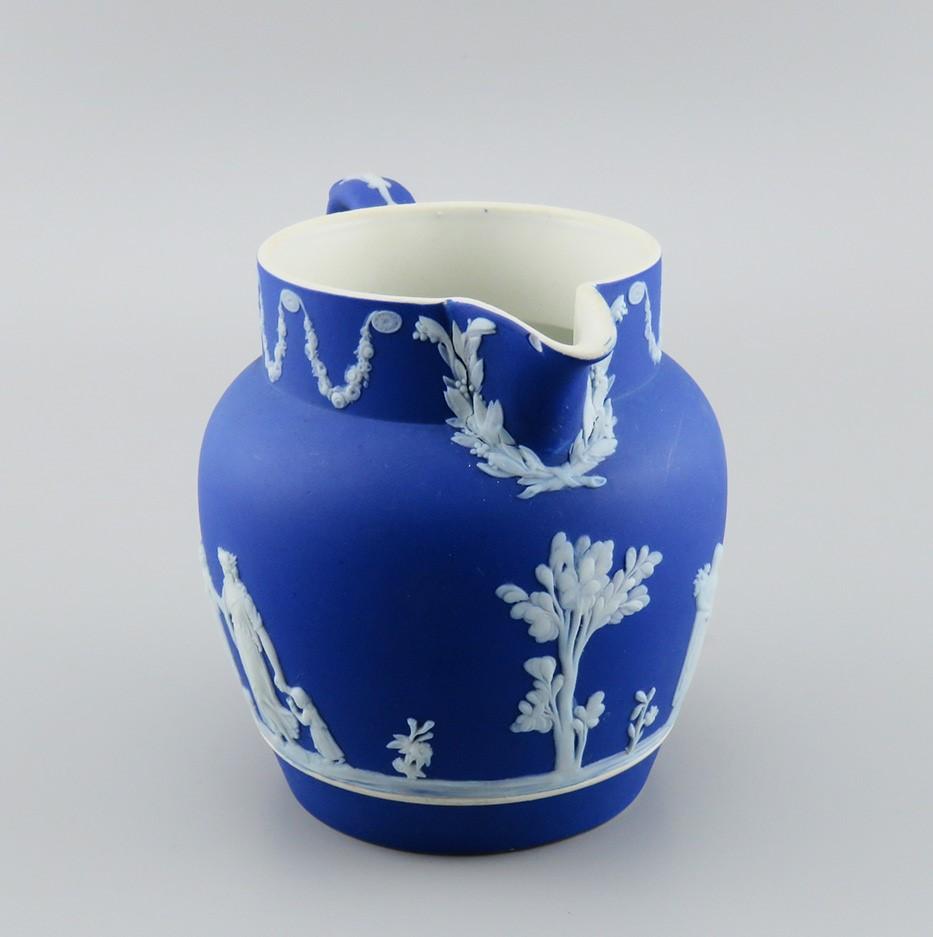 Presented is a lovely Wedgwood jasperware pitcher dating to around the 1920s-1930s. This pitcher is done in the classic dark blue color, a very rich blue against which the white jasper figures and foliate decoration really pop. The pitcher is a classical round shouldered type of form, with a band of detailed floral garland decoration around the top and bellflowers down the handle. Around the side are various Greco-Roman figures, with putti, trees and flowers around them. The pitcher has a capacity of about 3 cups, or 24 fluid ounces/710 milliliters.