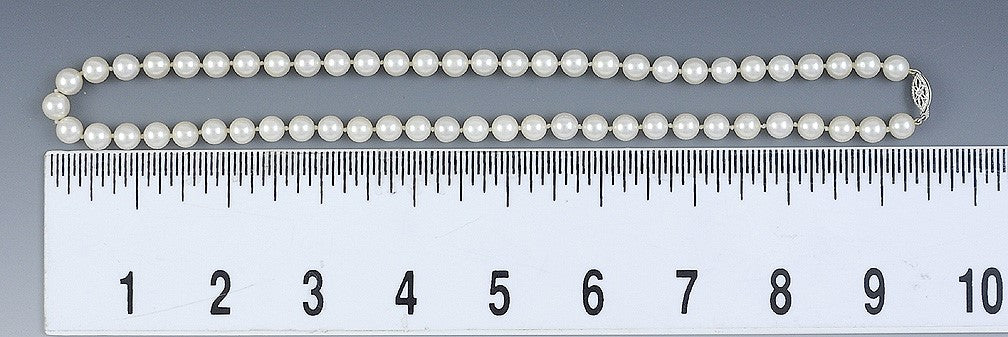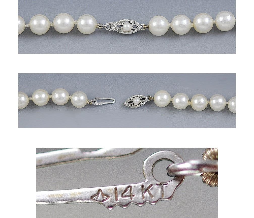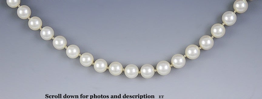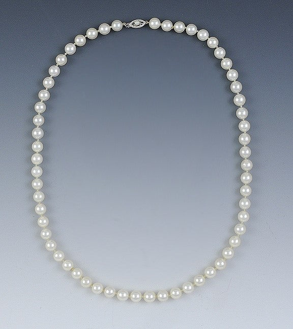 Presented is a beautiful example of the classic strand of pearls. The pearls are fairly uniform in shape and size, about 7mm, and all have great lustre, with very faint rose-gold highlights. These are salt-water pearls, and are probably cultured, although we do not know for sure. The necklace fastens with a white gold fish hook clasp, which is very secure, which is itself adorned with a single small pearl. This is a very simple and attractive necklace--you can never go wrong with pearls.
