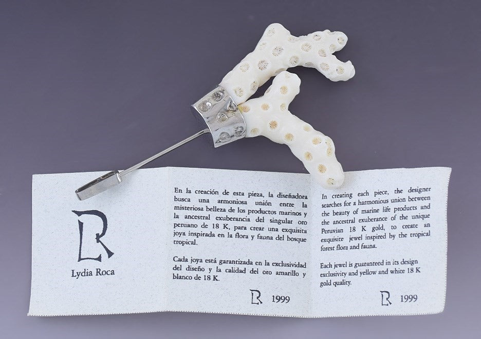 Presented is a very unique, natural coral and 18 karat white gold stickpin made by Lydia Roca. This Peruvian designer uses natural elements to create beautiful and distinct jewelry. This particular pin is made from natural white coral and is securely bezel set with a white gold mounting that is textured to match the surface of the coral piece. This piece comes with its original 18 karat gold stopper and is in its original box.