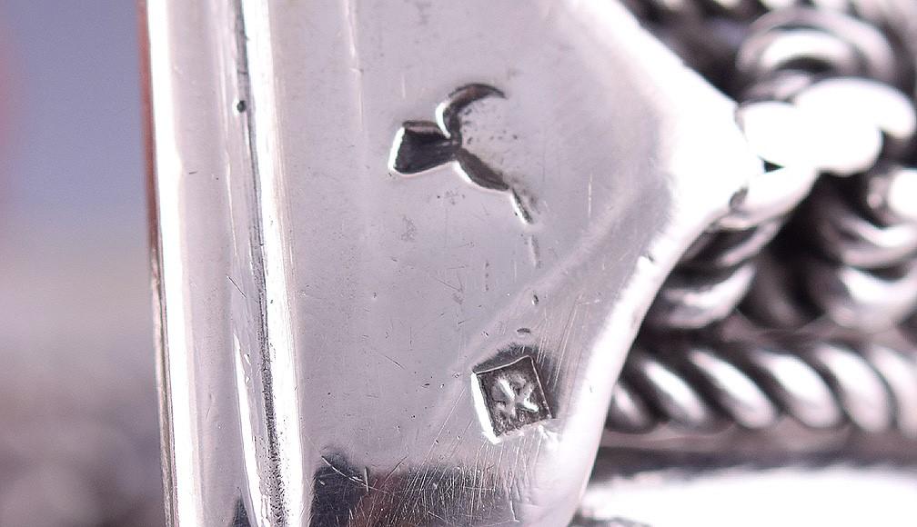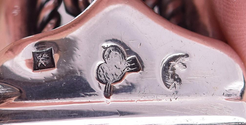 It is of 900 silver purity, tested and guaranteed. It is hallmarked in several places, signifying the maker's marks, etc.