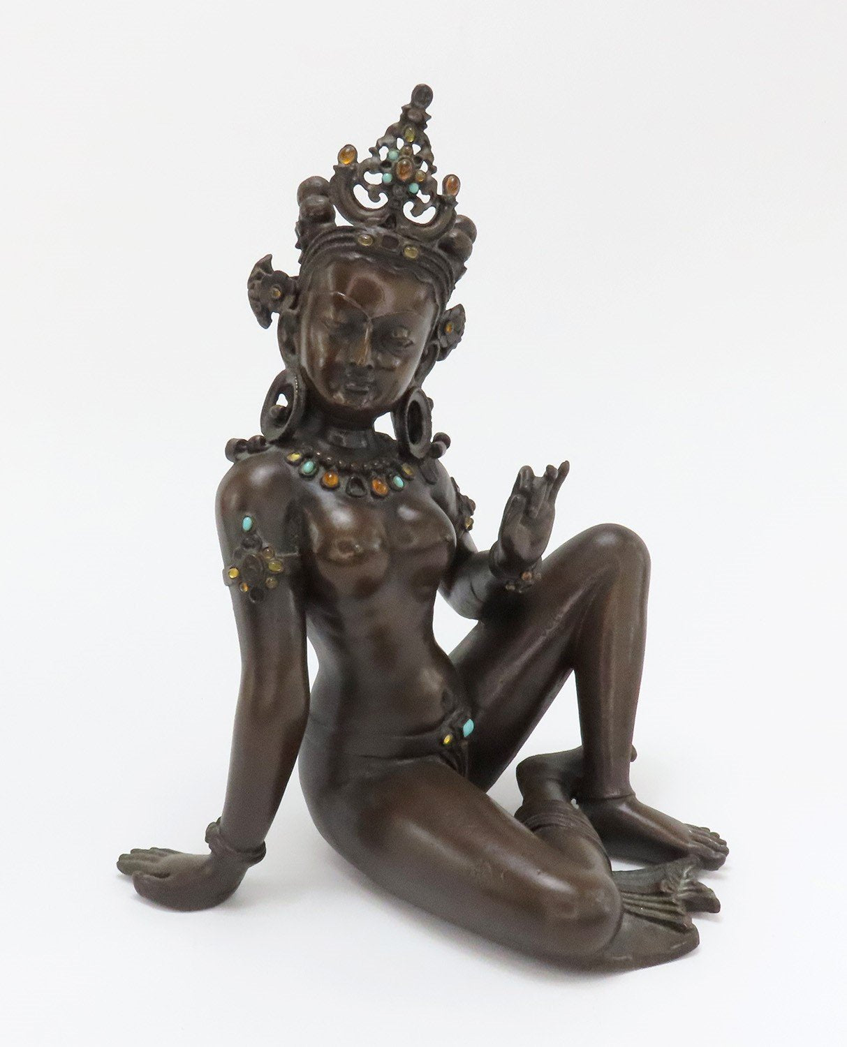 Presented is a fantastic quality bronze statue sold by the Metropolitan Museum of Art in 1988, after the Nepalese original dating to the 9th or 10th century. The statue depicts a seated figure of Uma, mother goddess and consort of Shiva, with whom she was originally depicted as one figural grouping. The bronze is very detailed and well done, with regal facial features, ornate flowery openwork headdress, and little orange and turquoise color gems adorning the goddess' jewelry. This bronze would have been a very high end item from the MMA, rendered so faithful and very nearly life-size to the original as it is.