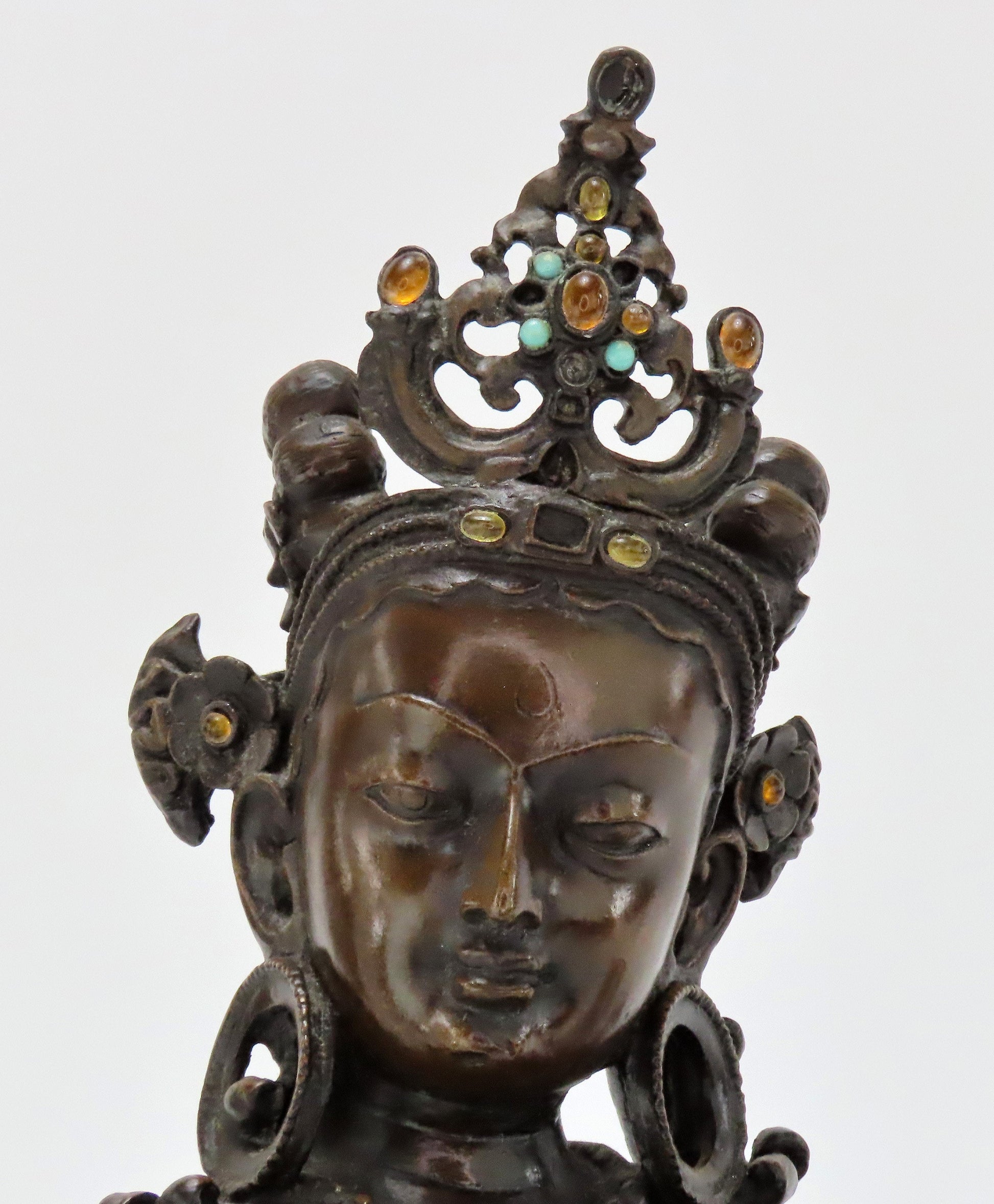 This statue is in great overall condition. There are no breaks or repairs to the bronze itself. The patina is in great shape. The glass/semiprecious gemstones adorning her headdress and jewelry have some losses, which for the most part is a deliberate recreation of the original statue's condition. A couple of the gemstone settings have some visible glue, however, which means those stones are indeed missing. Of course, considering the nature of the piece, this is going to be very hard to distinguish.